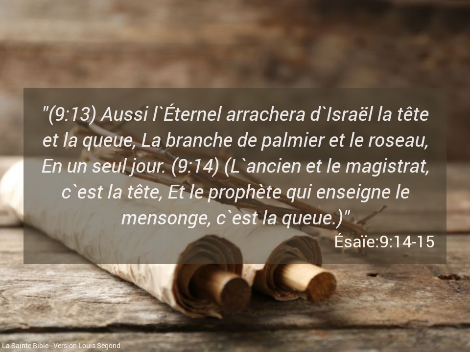 La tête et la queue brûlent. Chlomo mon frère, chlomo ma sœur. Chlomo : bonjour en Araméen. Pourquoi les panneaux de signalisation existent ? Chaque chauffeur sait que ces panneaux avertissent de l’imminence d’un danger. Malheureusement le non-respect de ces règles dans la circulation entraîne beaucoup d’accidents. Dans le monde spirituel aussi, […]