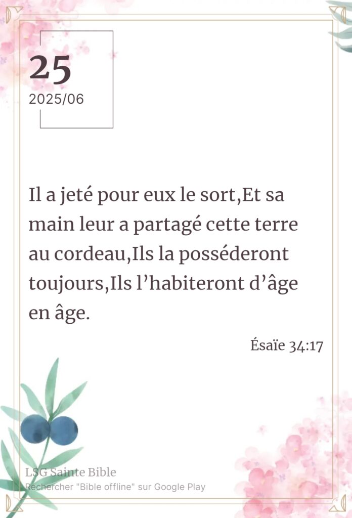 La décision de Dieu Sabah Alkhayir mon frère, Sabah Alkhayir ma sœur.Sabah Alkhayir : bonjour en Arabe. Quand l’Eternel combat pour nous, rien ne peut nous arrêter; car ce qu’IL décide personne ne peut changer. Nous lisons ”Il a jeté pour eux le sort, Et sa main leur a partagé cette terre au cordeau, Ils […]
