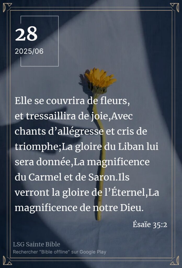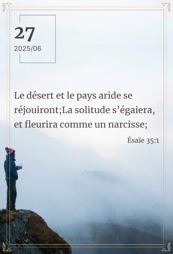 La renaissance Sabah Alkhayir mon frère, Sabah Alkhayir ma sœur. Sabah Alkhayir : bonjour en Arabe. Le Seigneur prévoit toujours un temps de restauration après le déluge. Ce matin la Parole nous rappelle cette réalité. ”Le désert et le pays aride se réjouiront; La solitude s’égaiera, et fleurira comme un narcisse”. Ésaïe 35:1. Il s’agit visiblement d’un […]
