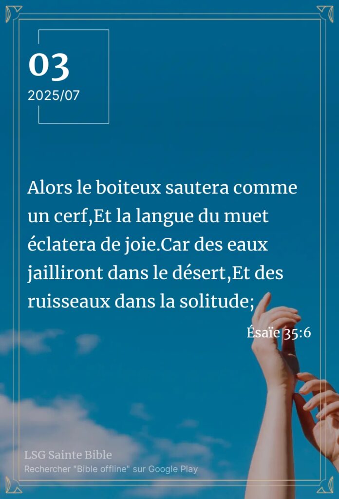 Une nouvelle ère.Sabah Alkhayir mon frère, Sabah Alkhayir ma sœur.Sabah Alkhayir : bonjour en Arabe. La Parole déclare que la fin d’une action, d’une chose vaut mieux que son commencement (Ecclésiaste 7:8). C’est vrai, car beaucoup abandonnent avant la fin. Ils perdent ainsi leur bénédiction. Ce matin, la Parole nous invite à vivre dans cette […]