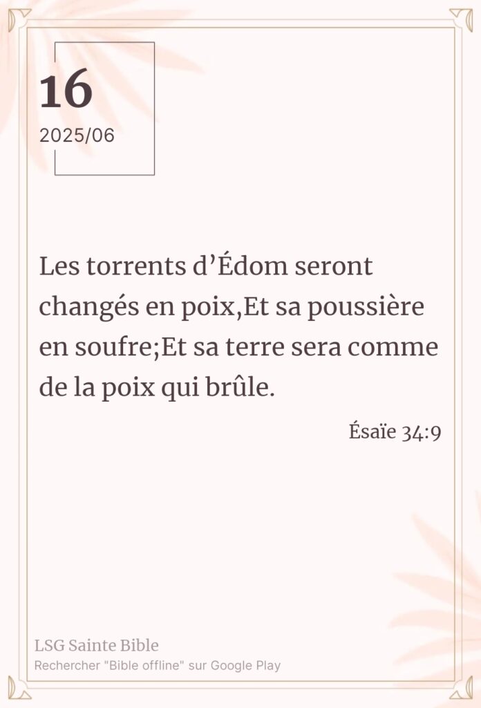 Les torrents d’Edom. Sabah Alkhayir mon frère, Sabah Alkhayir ma sœur. Sabah Alkhayir : bonjour en Arabe. Les armes de Dieu ne sont pas exhaustives. Il y a plusieurs types et plusieurs méthodes que l’Éternel peut utiliser pour exercer Sa colère. Ce matin nous lisons ”Les torrents d’Édom seront changés en poix, Et sa poussière en […]