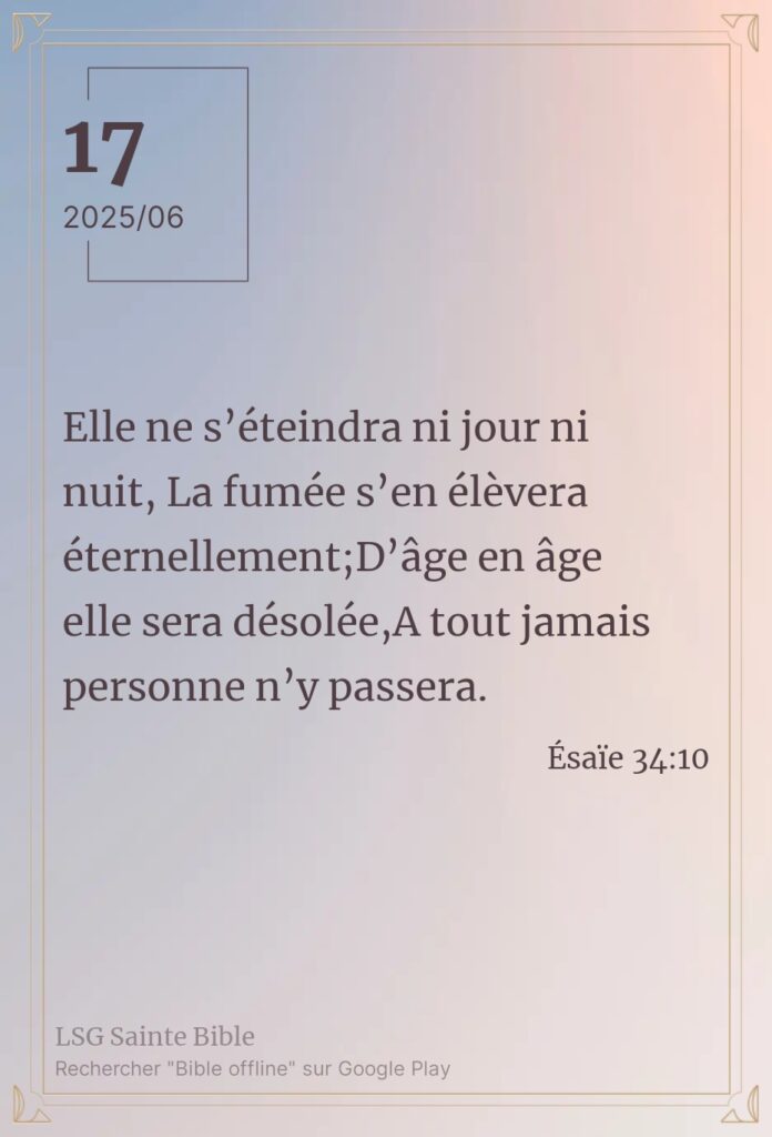 Le feu éternel. Sabah Alkhayir mon frère, Sabah Alkhayir ma sœur. Sabah Alkhayir : bonjour en Arabe. Quand l’Eternel commence Son combat, c’est un combat éternel sans fin. Son feu ne s’éteint pas. Ce matin nous lisons ”Elle ne s’éteindra ni jour ni nuit, La fumée s’en élèvera éternellement; D’âge en âge elle sera désolée, A […]