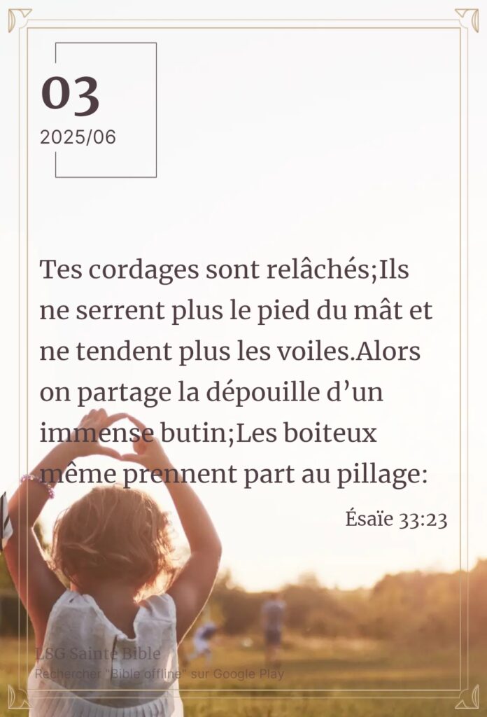 La victoire assurée. Sabah Alkhayir mon frère, Sabah Alkhayir ma sœur.Sabah Alkhayir : bonjour en Arabe. Quand on fait alliance avec l’Eternel, IL nous protège, nous sécurise et nous assure la victoire dans nos combats. Nous lisons ”Tes cordages sont relâchés; Ils ne serrent plus le pied du mât et ne tendent plus les voiles. […]