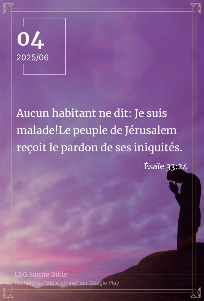 Amen au règne de l’Éternel Sabah Alkhayir mon frère, Sabah Alkhayir ma sœur. Sabah Alkhayir : bonjour en Arabe. Sous le règne de l’Éternel tous les soucis s’évaporent. Mon frère, ma sœur, c’est ce secret que l’Éternel nous révèle ce matin. Nous lisons ”Aucun habitant ne dit: Je suis malade! Le peuple de Jérusalem reçoit le […]