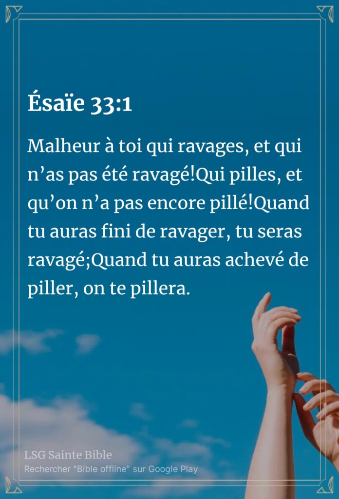Résumons le chapitre 33 Sabah Alkhayir mon frère, Sabah Alkhayir ma sœur.Sabah Alkhayir : bonjour en Arabe. Ce matin, nous résumons le chapitre 33 du livre d’Esaie. C’est un chapitre de jugement composé de trois parties. La première partie rappelle la chute de l’arrogant qui a oublié que l’Éternel règne (v1-4). L’Eternel brise ainsi le rêve […]