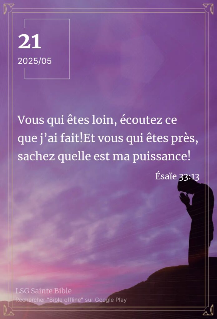 L’Eternel se révèle Sabah Alkhayir mon frère, Sabah Alkhayir ma sœur.Sabah Alkhayir : bonjour en Arabe. Quand les gens ne veulent pas écouter, l’Éternel LUI-MÊME, vient Se révéler. Ce matin nous lisons ”Vous qui êtes loin, écoutez ce que j’ai fait! Et vous qui êtes près, sachez quelle est ma puissance!”.Ésaïe 33:13. Pourquoi cette invitation […]
