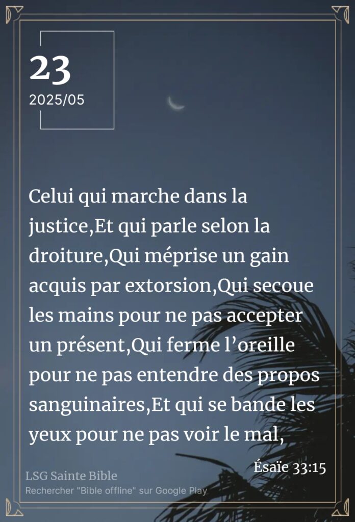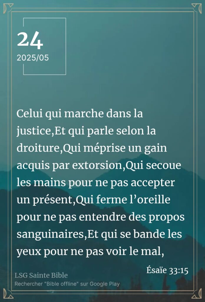 Marcher dans la justice.Sabah Alkhayir mon frère, Sabah Alkhayir ma sœur.Sabah Alkhayir : bonjour en Arabe. Hier nous avons abordé ce verset en nous promettant de revenir sur certaines expressions du texte. ‘‘ Celui qui marche dans la justice, Et qui parle selon la droiture, Qui méprise un gain acquis par extorsion, Qui secoue les […]