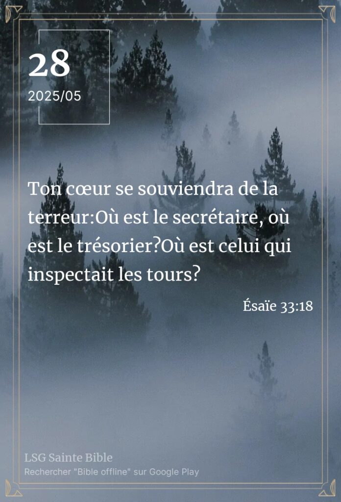 Les tristes souvenirs Sabah Alkhayir mon frère, Sabah Alkhayir ma sœur.Sabah Alkhayir : bonjour en Arabe. Quand l’Eternel prend le contrôle d’une vie, nos difficultés des temps présents et du passé deviennent des tristes souvenirs. Nous lisons ”Ton cœur se souviendra de la terreur: Où est le secrétaire, où est le trésorier? Où est celui qui […]