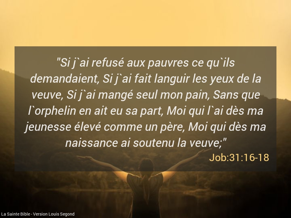 La vraie religion. Shalom Alekhem mon frère, ma sœur. Dans la Parole, Jacques attire notre attention sur une catégorie de personnes dans la société. Il s’agit des veuves et des orphelins. Ce matin, Job nous révèle sa droiture aussi à ce niveau. ”Si j’ai refusé aux pauvres ce qu’ils demandaient, Si j’ai fait […]
