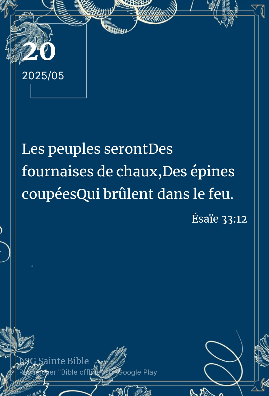Parler au Nom de l’Éternel n’est pas toujours facile. Il y a des jours où tu n’as pas envie de parler, mais comme l’apôtre Paul l’enseigne, ce n’est plus moi qui vit, mais Christ en moi (Galates 2:20). Cela suppose que je n’ai ni volonté, ni autre choix que Celui de l’Éternel. C’est dans cette stature que l’Éternel veut amener chacun. Dans cette dynamique soyons attentif à Sa Parole. Nous lisons ”Les peuples seront Des fournaises de chaux, Des épines coupées Qui brûlent dans le feu”. Ésaïe 33:12.