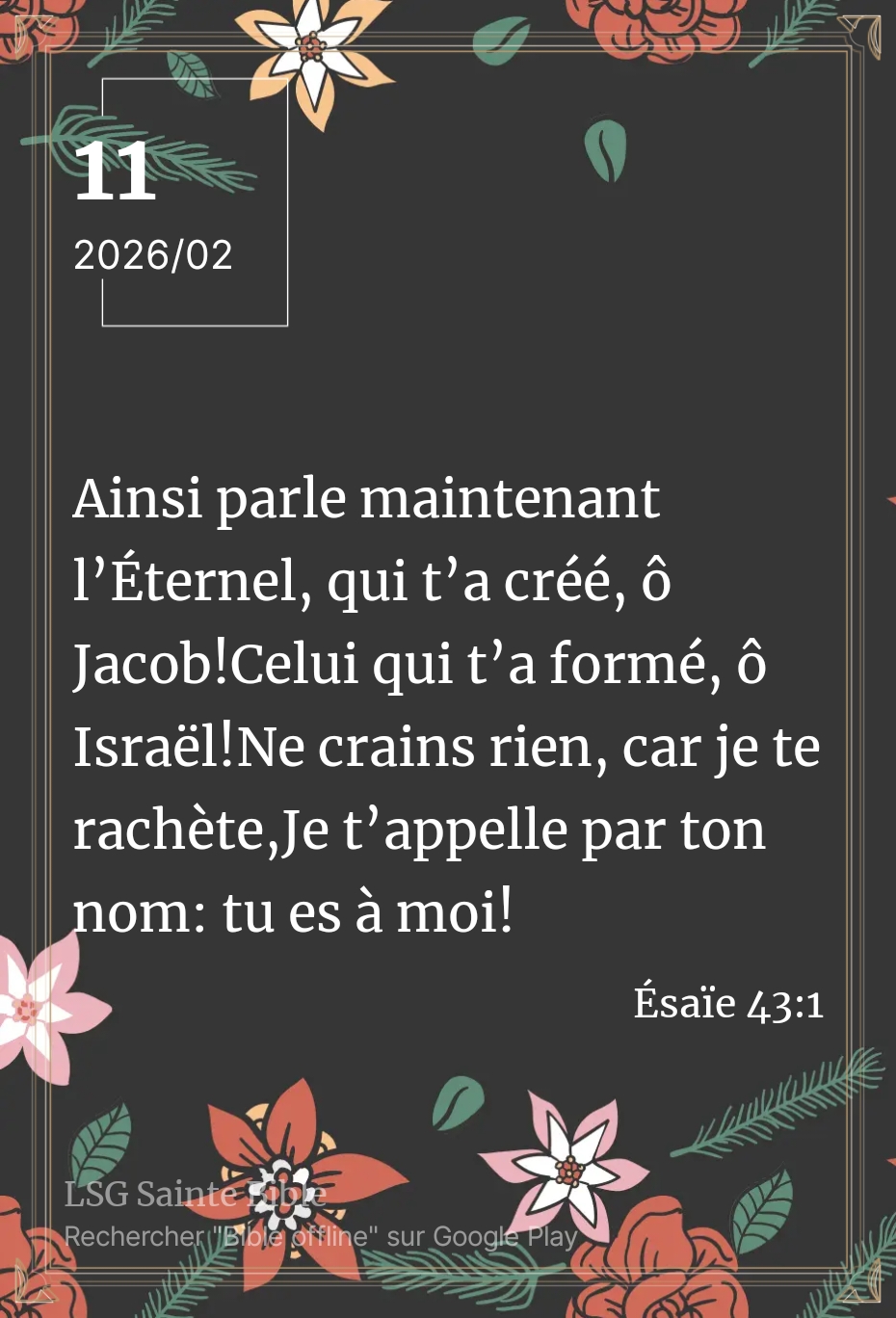 Le message de ce matin est personnel. Il faut le saisir. Il faut te l’approprier personnellement. L’Éternel te parle personnellement. Concentre-toi sur ce qui va être dit. Nous lisons”Ainsi parle maintenant l’Éternel, qui t’a créé, ô Jacob! Celui qui t’a formé, ô Israël! Ne crains rien, carje te rachète, Je t’appelle par ton nom: tu es à moi!”.Ésaïe 43:1.