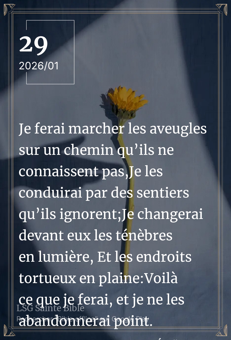 L’Éternel nous parle ici. C’est dire que nous devons faire confiance et nous pouvons faire confiance. IL prévoit ici de venir au secours des aveugles. IL décide d’accompagner les aveugles. C’est quoi un aveugle ? Aveugle vient du mot Hébreux : `ivver qui veut dire aveugle physiquement et spirituellement. C’est dire qu’on peut être aveugle avec les yeux grandement ouverts, ce qui veut dire que cette promesse concerne chacun de nous. Dieu nous fera marcher sur des chemins nouveaux pour toi et pour moi. IL changera les ténèbres en lumière devant nous. IL aplanira nos chantiers. Cette promesse est une réalité pour toi et pour moi. Mon frère, ma sœur, il y a de l’espoir pour toi avec Christ. Peut-être que tu as été déçu dans le passé ? Peut-être que tu es abattu à présent, ce matin cette promesse est la sienne. Que la paix et la grâce de inondent nos cœurs.