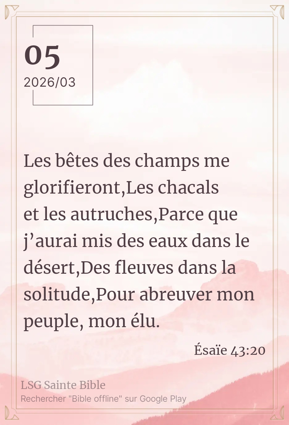Quand les principaux acteurs déçoivent, l’Éternel les remplace. Ce matin nous lisons”Les bêtes des champs me glorifieront, Les chacals et les autruches, Parce que j’aurai mis des eaux dans le désert, Des fleuves dans la solitude, Pour abreuver mon peuple, mon élu”.Ésaïe 43:20. Dans la dynamique de faire du bien à Son peuple, l’Éternel fait de nouvelles choses. Ici, IL fait jaillir une source d’eau dans le désert. Pour rappel, le désert est un lieu aride. C’est la symbolique d’un endroit où la vie est difficile. Le changement de posture avec l’apparition d’une source d’eau profite aux animaux qui vivent dans ces zones désertiques. On comprend facilement leur réjouissance et leur action de grâce à l’Éternel. Mon frère, ma sœur, pour toi l’Éternel fait de grandes choses. A cause de toi beaucoup se réjouissent. Mais est-ce que tu en profite ? Comme Jésus-Christ l’annonçait”Or, je vous déclare que plusieurs viendront de l’orient et de l’occident, et seront à table avec Abraham, Isaac et Jacob, dans le royaume des cieux. Mais les fils du royaume seront jetés dans les ténèbres du dehors, où il y aura des pleurs et des grincements de dents”. Matthieu 8:11-12. Ma prière est que tu ne sois pas du nombre de ceux qui auront des pleurs et des grincements de dents. Que la paix et la grâce de Dieu renouvellent nos forces.
