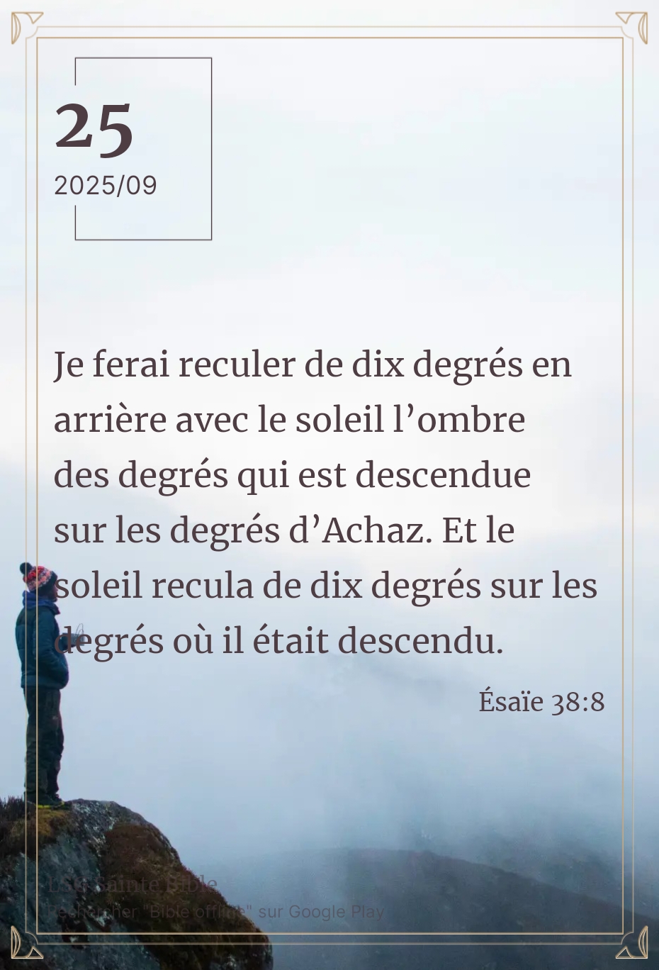 Parfois nous ne réalisons pas ce que Dieu fait pour nous. Tout cela à cause de Sa fidélité et de Son Amour. Nous lisons ce matin “Je ferai reculer de dix degrés en arrière avec le soleil l’ombre des degrés qui est descendue sur les degrés d’Achaz. Et le soleil recula de dix degrés sur les degrés où il était descendu”.Ésaïe 38:8.