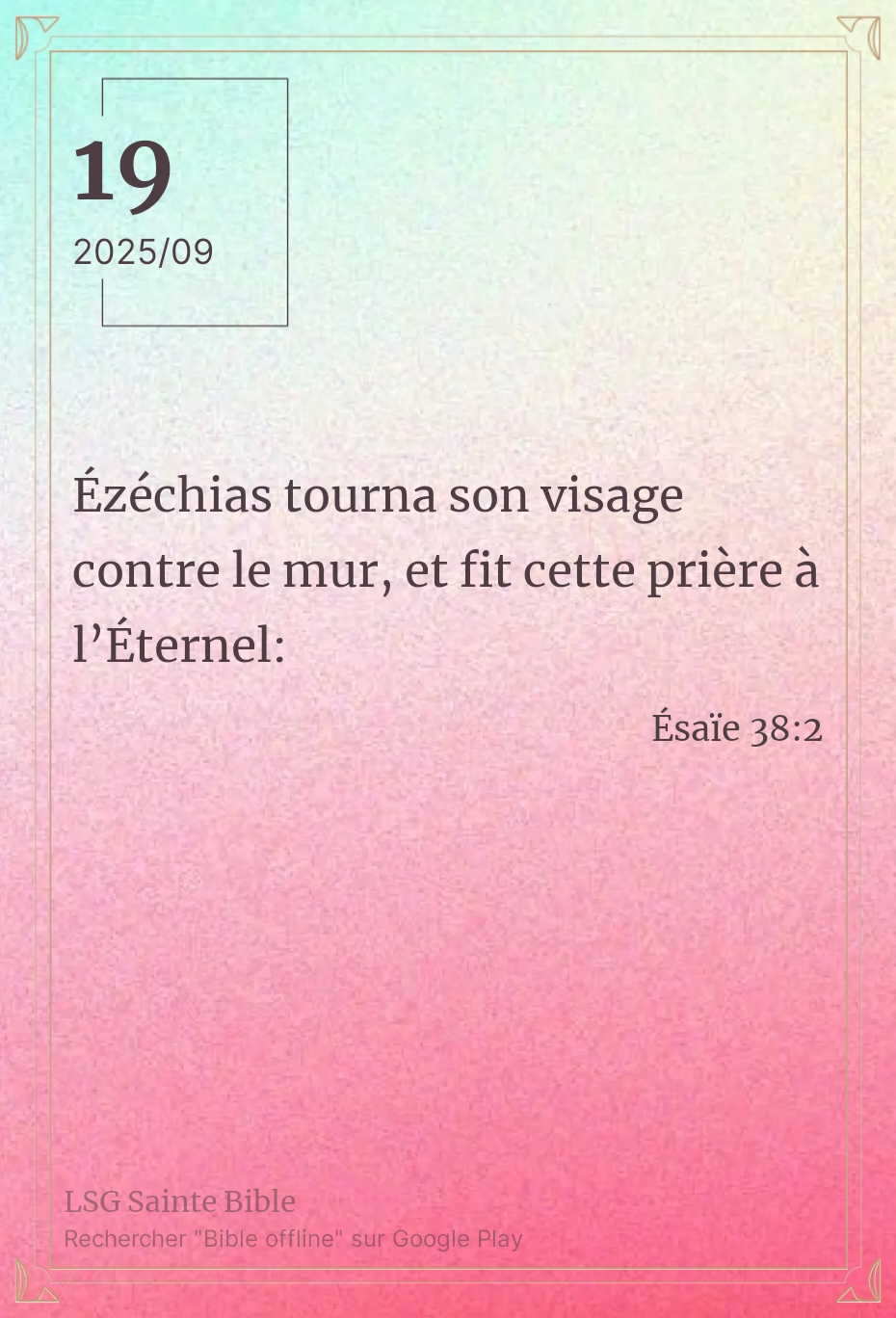 Face à cette nouvelle menace existentielle, Ezéchias récidive à nouveau. Nous remarquons ici qu’il tourne le visage contre le mur. A la différence avec la première fois, le roi Ezéchias à défaut de pouvoir s’isoler tourne le visage contre le mur. En clair c’est pour détourner ses regards de son environnement immédiat pour se tourner vers le Seigneur. Oui pour plus d’efficacité dans la prière, chacun doit créer sa propre chambre haute. C’est là que le face-à-face avec l’Eternel se fait. Ezéchias ne déroge pas à la règle. Mon frère, ma sœur, est-ce que tu as cultiver cette habitude ? N’attends pas les moments difficiles pour commencer à tourner ton regard vers le Seigneur, mais plutôt exercice toi dans les moments de paix . C’est la symbolique d’une relation d’amitié, d’intimité avec le Seigneur qu’il faut cultiver cette habitude. Que la paix et la grâce de Dieu renouvellent notre intelligence.