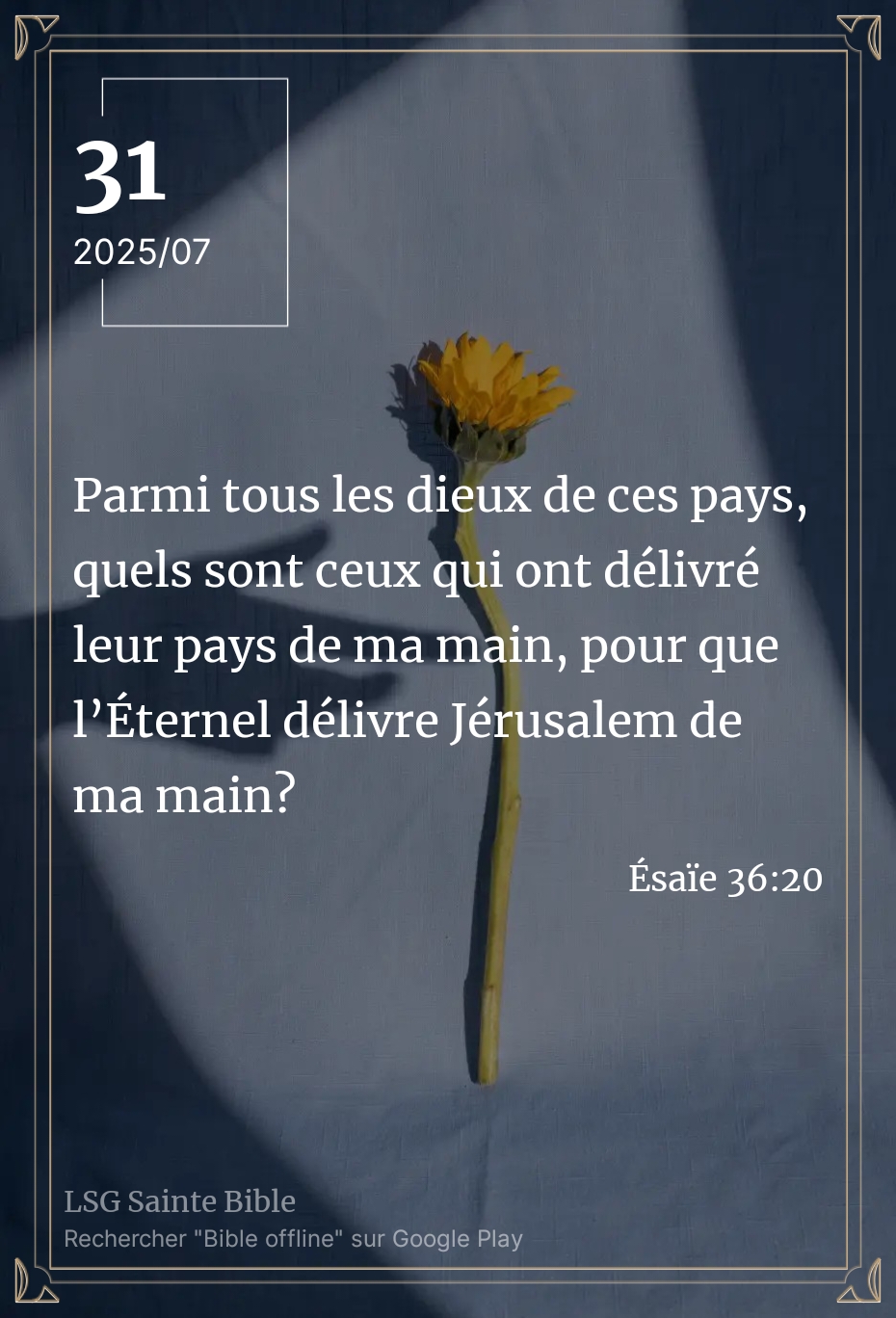Dans la vie nous commettons beaucoup d’erreurs au nombre desquelles le fait de ramener l’Eternel à notre niveau. C’est une erreur grave. Nous lisons ce matin ”Parmi tous les dieux de ces pays, quels sont ceux qui ont délivré leur pays de ma main, pour que l’Éternel délivre Jérusalem de ma main?”. Ésaïe 36:20.