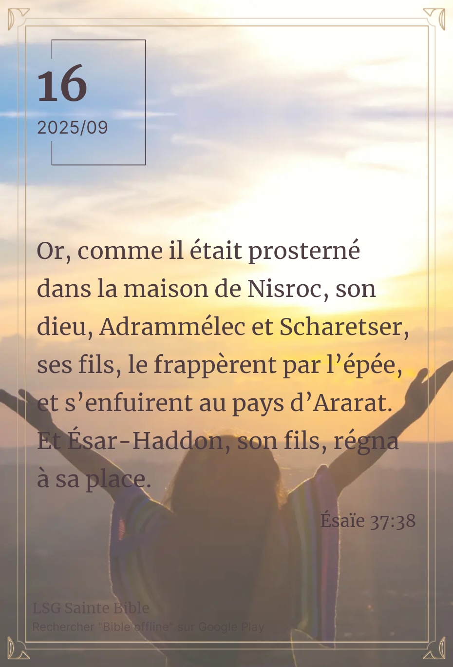 On se souvient que c’est ce roi Sanchérib qui menaçait le roi Ezéchias et son peuple. Il utilisait une style arrogant méprisant même la présence et l’autorité de Dieu Qui a créé toute chose et par Qui toute chose existe. Ce matin notre texte nous révèle comment sa vie se termine. De même que Sanchérib a disparu, je déclare ce matin que l’Éternel a mis fin à la course de tous ceux qui se dressent directement ou indirectementcontre moi et contre toi. Comme Sanchérib, ils disparaissent comme l’éclair du tonnerre. Leur force est la cause de leur perte. Le fruit de leurs entrailles est la cause de leur chute. C’est écrit, c’est acté. Que la paix et la grâce de l’Éternel renouvellent tes forces.