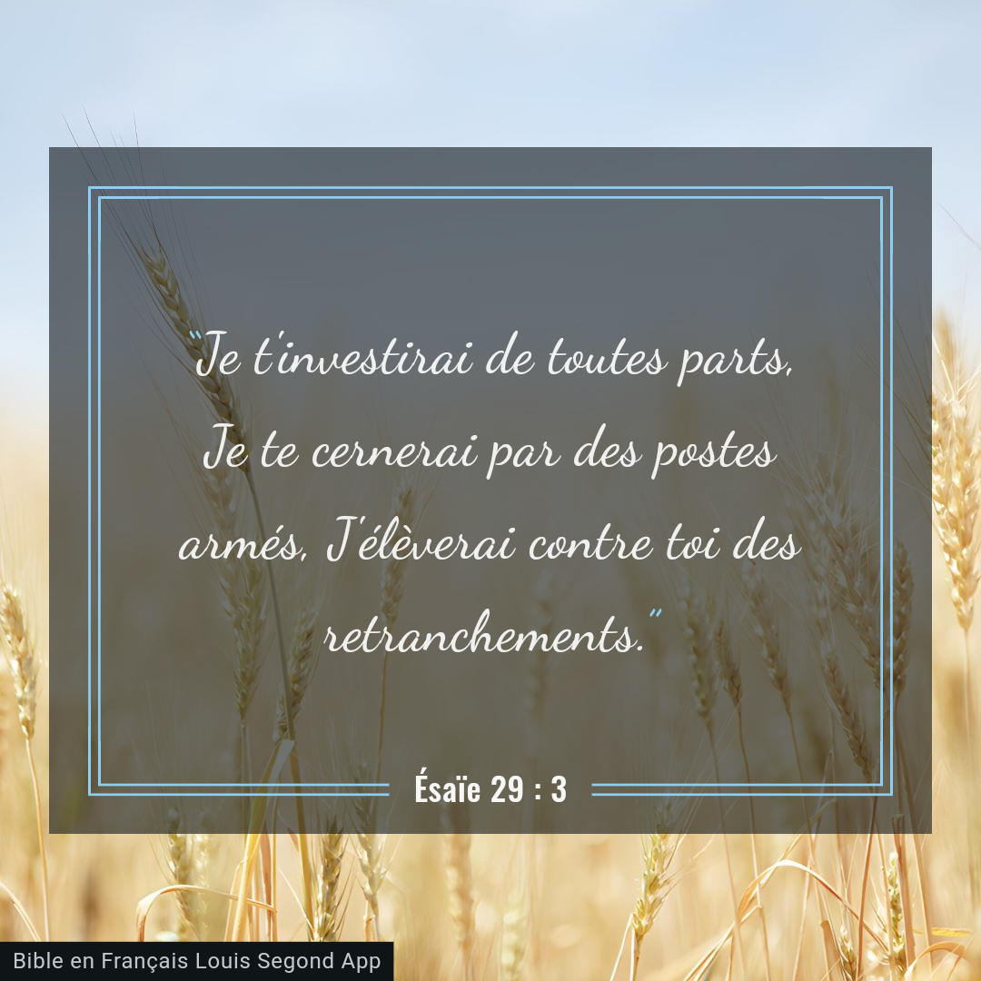 Ce matin nous poursuivons notre analyse de la situation de la cité de David. Nous lisons ”Je t’investirai de toutes parts, Je te cernerai par des postes armés, J’élèverai contre toi des retranchements”. Ésaïe 29 : 3.Que la paix et la grâce de Dieu renouvellent notre intelligence.