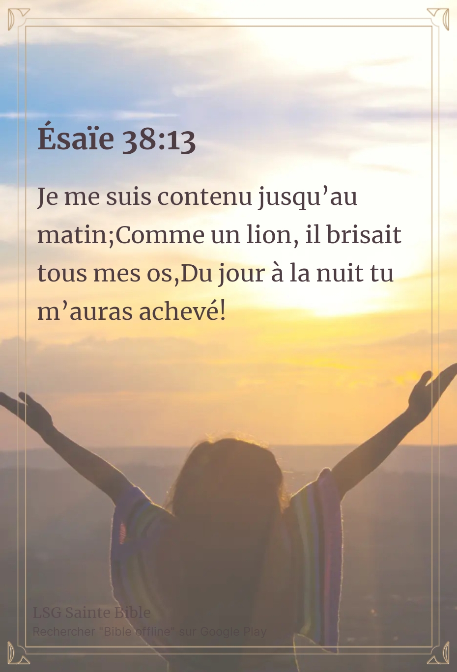 Nous sommes tous habité par une crainte, celle de la mort. Ce matin lisons ”Je me suis contenu jusqu’au matin; Comme un lion, il brisait tous mes os, Du jour à la nuit tu m’auras achevé!”.Ésaïe 38:13.