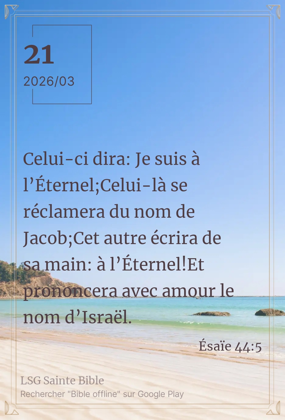 Prendra sur sa main la marque (le signe, le nom) de l’Eternel. Cette image exprime la joyeuse confession du nom de l’Eternel ; elle est tirée de l’usage, très répandu de nos jours encore en Orient de se tatouer. Chez les Arabes, il y a des gens qui font le métier de tatoueurs. Les païens prenaient sur le front, les bras, les mains, le signe (le nom) de leurs dieux, On se marque du chiffre de ceux qu’on aime. Comparez Exode 13.16 ; Apocalypse 13.16”.