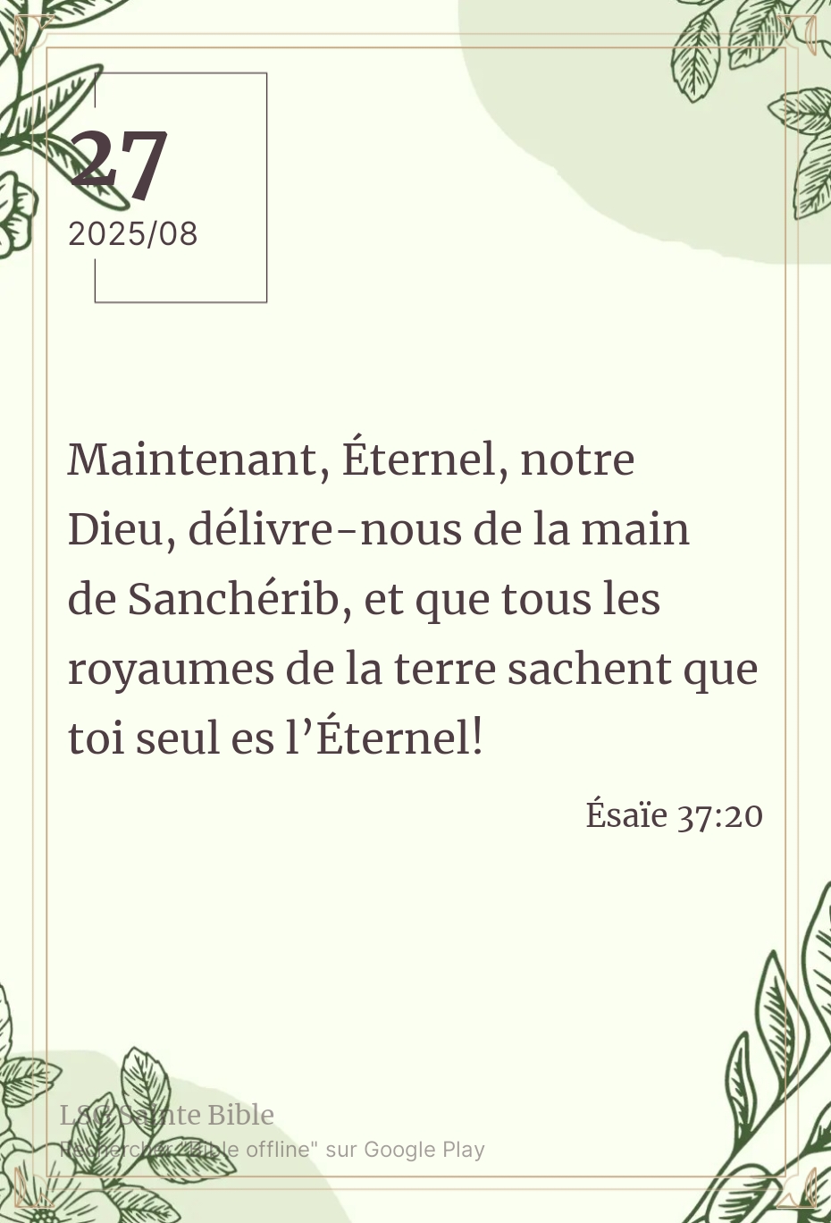 Ici la requête du roi Ezéchias est précise. Il veut être débarrassé de la menace de Sanchérib. Mais il y a une précision qui mérite d’être relevée. Le but de cette requête est de glorifier l’Eternel. Que tous les royaumes saches que l’Éternel est LE SEUL vrai Dieu. C’est comme l’expression que nous utilisons parfois à tord : que toute la gloire revienne à l’Éternel. On peut facilement déduire que le problème principal du roi Ezéchias, était d’éviter que l’Éternel ne subisse le même sort que les dieux des autres royaumes. En cela sa vie compte peu pour lui. C’est à cette dimension que l’Éternel veut que chacun arrive. Comme je l’ai souvent enseigné, le secret qui se cachait derrière l’épreuve de Job. C’est aussi le grand secret qui se cache derrière Cette Parole du Seigneur ”Cherchez premièrement le royaume et la justice de Dieu; et toutes ces choses vous seront données par-dessus”. Matthieu 6:33. La question que l’on se pose ou qu’on devrait se poser ce matin est: est-ce que Dieu occupe cette place prioritaire dans mes prières ? Que la paix et la grâce de Dieu renouvellent nos forces afin d’évoluer vers cette dimension. Que la paix et la grâce de Dieu nous accompagnent.