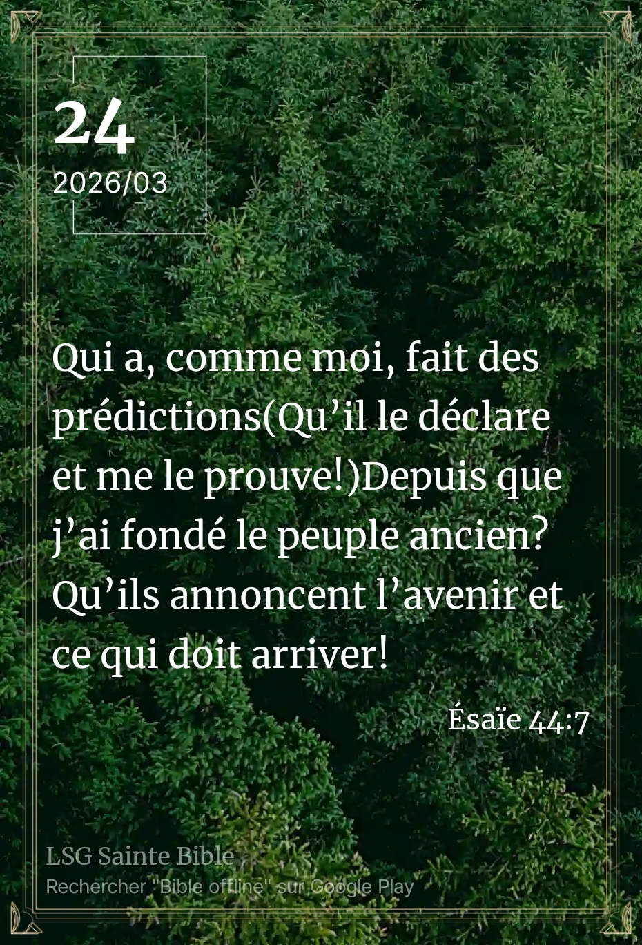 L’Éternel nous pose ici une question qui engage notre responsabilité. Nous lisons ”Qui a, comme moi, fait des prédictions (Qu’il le déclare et me le prouve!) Depuis que j’ai fondé le peuple ancien? Qu’ils annoncent l’avenir et ce qui doit arriver!”Ésaïe 44:7.