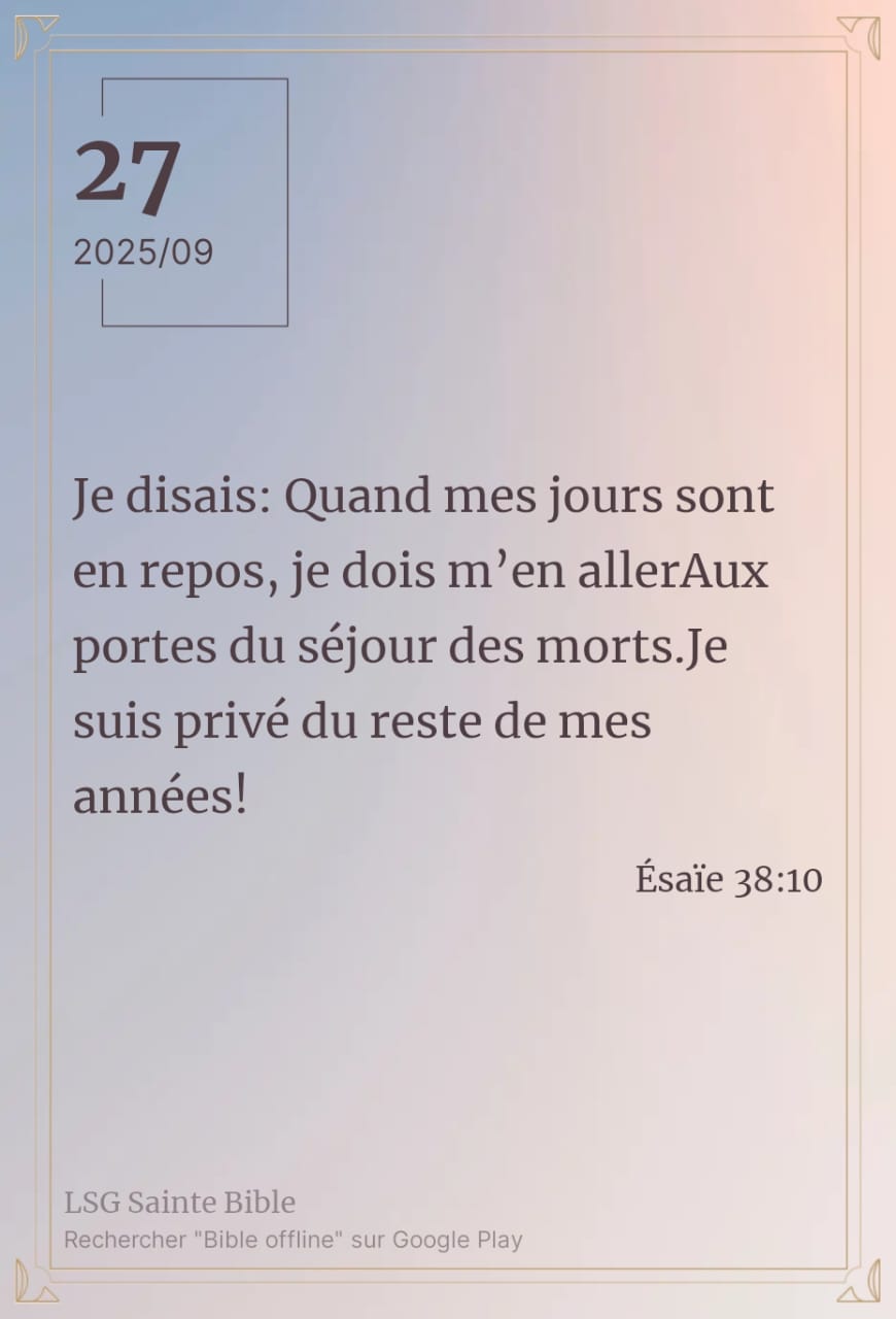 De prime abord on se rend compte que le roi Ezéchias se pose en revendicateur du reste de son temps sur cette terre. Nous comprenons qu’il venait de subir une épreuve difficile avec l’attaque de Sanchérib, suivie de sa maladie. Dans sa logique, il pensait pouvoir jouir d’un temps de repos bien mérité. N’est-ce pas la même erreur que beaucoup commettent ? Nous pensons qu’avec Dieu nous avons des droits. Cela peut bien se discuter. En effet, si nous avons le droit de nous approprier les promesses de Dieu, leurs accomplissements relèvent de Sa Seule discrétion. C’est donc par pure grâce que nous vivons certains accomplissement. Ici le roi Ezéchias pensait que son obéissance lui conférait un droit imaginé à sa façon. Or notre définition du repos, de la paix ne correspond pas forcément à Celui de l’Éternel. Ce matin je voudrais t’inviter à t’inscrire dans la vision de Dieu plutôt que d’imaginer les choses à ta façon. Cela éviterait les erreurs et les déceptions dues au manque d’accomplissement selon nos attentes. C’est là encore une question personnelle. Que décides-tu ? Que la paix et la grâce de Dieu renouvellent nos forces.