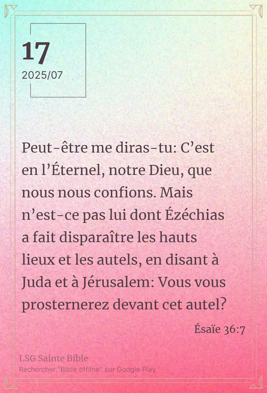 Permettez-moi d’emprunter ce matin ce terme du langage des jeunes : la séduction pro max. En d’autres termes la séduction au summum. Ce matin la Parole nous oriente à nouveau ”Peut-être me diras-tu: C’est en l’Éternel, notre Dieu, que nous nous confions. Mais n’est-ce pas lui dont Ézéchias a fait disparaître les hauts lieux et les autels, en disant à Juda et à Jérusalem: Vous vous prosternerez devant cet autel?”. Ésaïe 36:7.