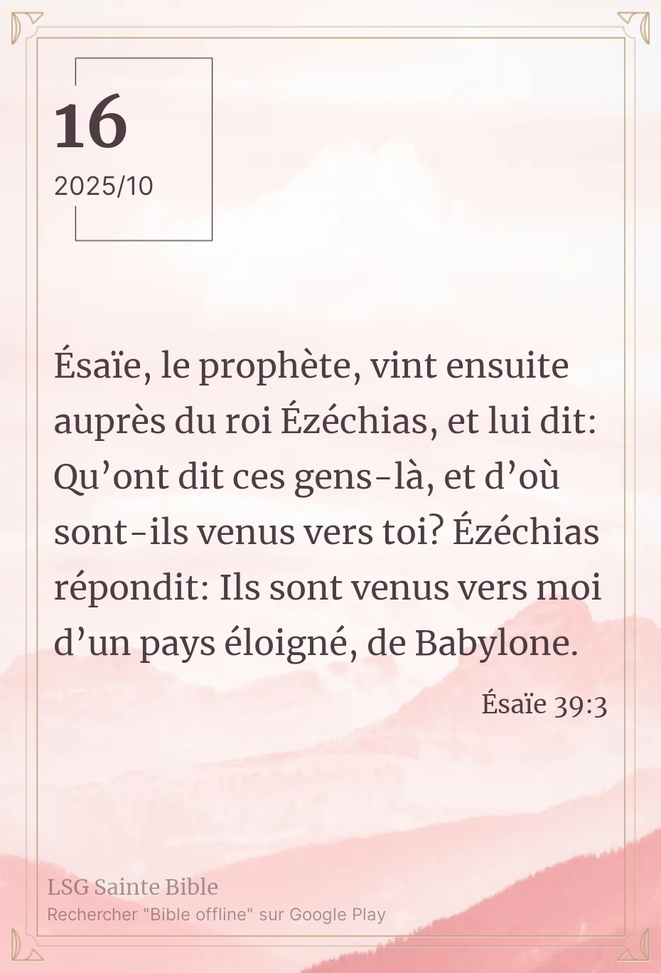 Dieu a établi une sentinelle pour chacun de nous. Elle nous alerte du danger à venir afin que nous puissions prendre des dispositions. Ce matin nous lisons ”Ésaïe, le prophète, vint ensuite auprès du roi Ézéchias, et lui dit: Qu’ont dit ces gens-là, et d’où sont-ils venus vers toi? Ézéchias répondit: Ils sont venus vers moi d’un pays éloigné, de Babylone”. Ésaïe 39:3.