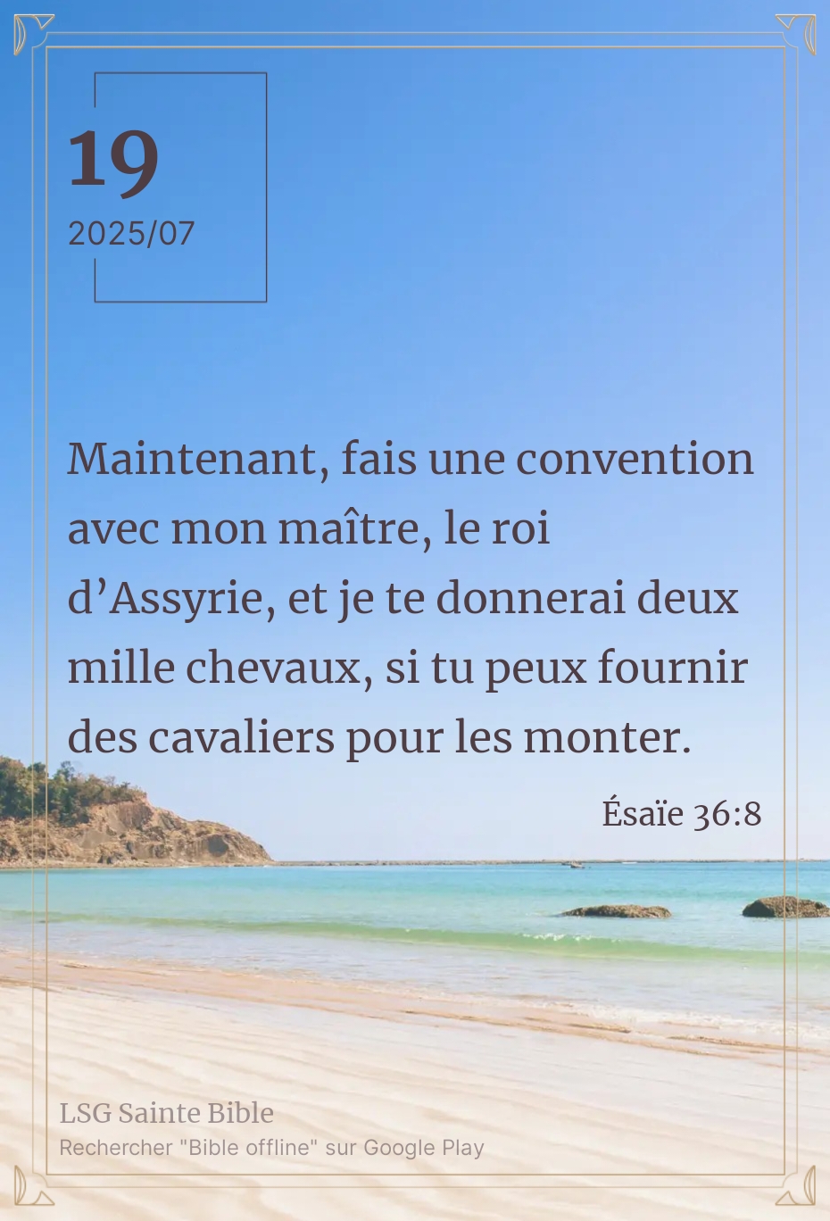 J’aimerais que l’on revienne sur notre texte d’hier. Il y a un aspect très important que nous risquons d’occulter. Nous lisons ”Maintenant, fais une convention avec mon maître, le roi d’Assyrie, et je te donnerai deux mille chevaux, si tu peux fournir des cavaliers pour les monter”. Ésaïe 36:8.