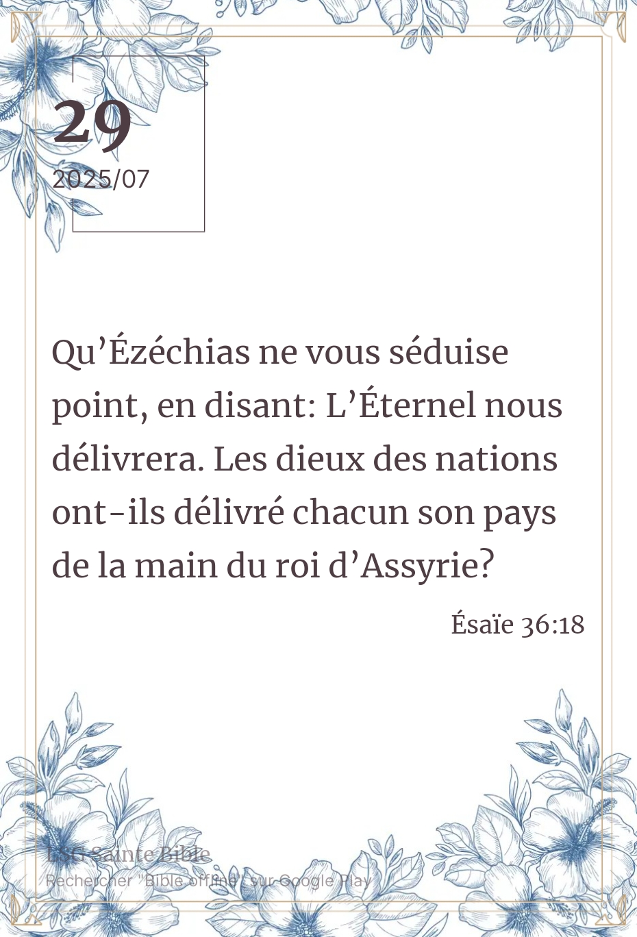 Dans ce chapitre , nous constatons que Rabschaké vise un objectif majeur : couper ou briser la relation entre le peuple et l’Éternel. Il tente de persuader le peuple à se séparer de l’Éternel. Ce qui choque ici à priori c’est le fait de comparer l’Éternel aux dieux étrangers. C’est vrai si les dieux faits de mains d’homme ne peuvent pas délivrer ses adeptes, l’Éternel délivre les Siens. Le retour des captifs de Babylone est une illustration. De même la séparation de la mer rouge (Exode 14) ou encore du Jourdain (Josué 3:17) pour permettre le passage des enfants d’Israël illustrent mieux cette situation. Nous pouvons ajouter la délivrance de Daniel dans la fosse aux lions (Daniel 6:17-24), ou encore ses trois compagnons de la grande fournaise (Daniel 3:19-28). Il y a suffisamment d’exemples qui prouvent que l’Éternel est Vivant et Efficace pour délivrer et pour sauver.Alors pourquoi Rabschaké s’attaque à cette relation entre Dieu et le peuple ? Avant de répondre, revoyons le conseil de Balam à Balak. Nombres 31:16”Voici, ce sont elles qui, sur la parole de Balaam, ont entraîné les enfants d’Israël à l’infidélité envers l’Eternel, dans l’affaire de Peor; et alors éclata la plaie dans l’assemblée de l’Eternel”. Jude1:11, 2 Pierre 2:15, confirment cette mauvaise conduite d’un prophète de l’Éternel. Mon frère, ma sœur, tout comme Balam et Rabschaké, l’objectif de Satan est de nous couper de l’Arbre de vie et de la victoire afin de mieux nous détruire. Ce matin la Parole nous rappelle cette réalité et nous invite à fuir ce piège. Comme Rabschaké, le diable ne capitulera pas, c’est à nous d’être vigilant et ferme. Que la paix et la grâce de Dieu renouvellent notre intelligence.