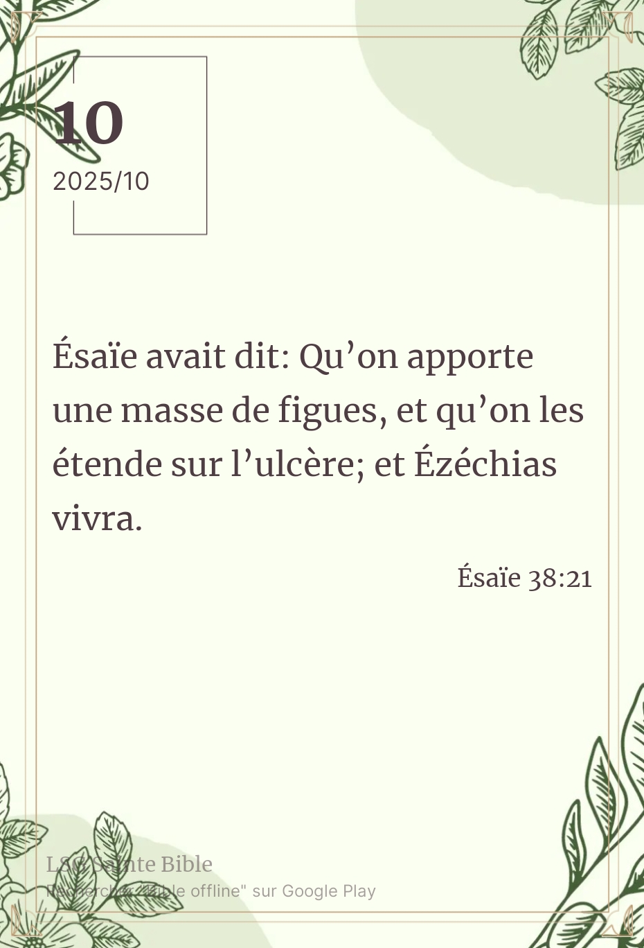 D’après les commentaires de la Bible, ces grappes de figues pourraient correspondre à des poudres de figues. En effet l’application d’un emplâtre de figues est le moyen naturel pour faire mûrir l’abcès et hâter la guérison (on peut supposer qu’il s’agit d’un anthrax ou charbon). La puissance divine, sans se lier à la nature, opère souvent par son moyen (voyez, par exemple, la guérison de Naaman par l’eau du Jourdain, 2 Rois 5.1-27). C’est dire que l’Éternel peut passer par tous les moyens pour accomplir Sa Parole dans ta vie. Ce matin je ne sais pas quel chemin ni quel moyen IL empruntera, mais je sais une chose, c’est qu’IL écoute nos prières. Si nous savons qu’IL écoute nos prières, alors IL peut passer par tous les moyens pour nous satisfaire. Ne néglige donc pas ce petit nuage de la taille d’une paume de main (1 Rois 18:44) c’est le début de la pluie qui mettra fin à ta sécheresse spirituelle, morale, physique, financière et professionnelle. Ne néglige pas cette petite braise c’est le début de ta délivrance et de ta restauration totale (Exode 3:2-22). Alors persévère, ne désespère pas. Que la paix et la grâce de Dieu renouvellent nos forces et nous donnent de marcher avec LUI dans la victoire.