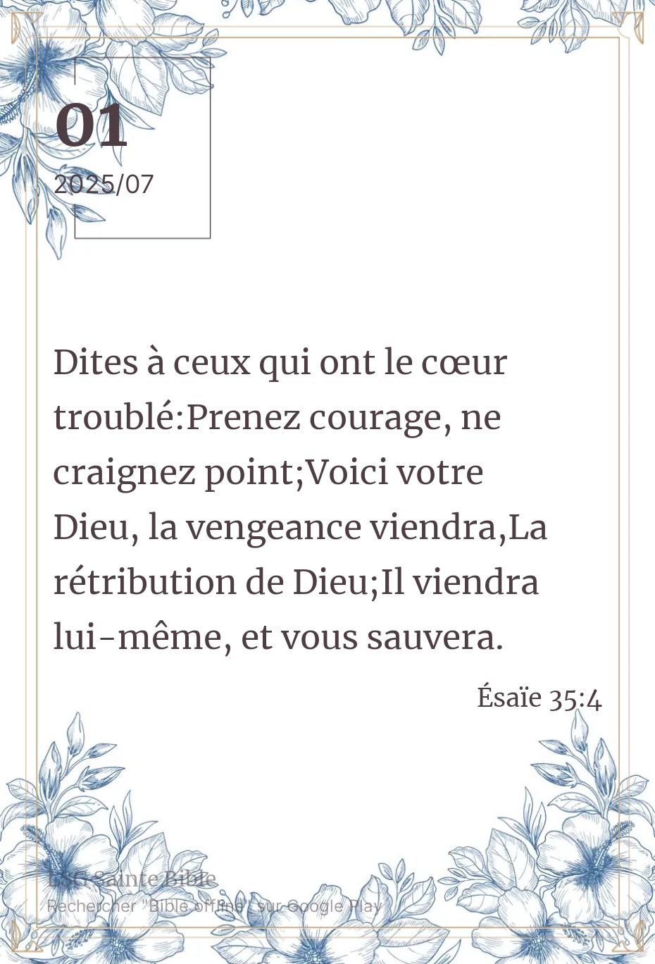 Quand le méchant agit, il oublie que Dieu a la maîtrise du temps et des circonstances. Il ne s’imagine pas que Dieu voit tout et fera passer tout en jugement. Ce matin nous lisons ”Dites à ceux qui ont le cœur troublé: Prenez courage, ne craignez point; Voici votre Dieu, la vengeance viendra, La rétribution de Dieu; Il viendra lui-même, et vous sauvera”. Ésaïe 35:4.