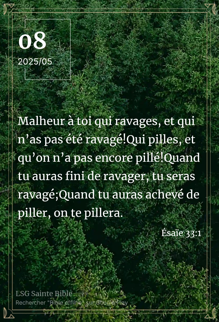Celui qui prend plaisir à faire du mal aux autres, gagne en confiance. Il oublie même qu’il est un homme mortel. Ce matin la Parole nous rappelle ce qui les attend. ”Malheur à toi qui ravages, et qui n’as pas été ravagé! Qui pilles, et qu’on n’a pas encore pillé! Quand tu auras fini de ravager, tu seras ravagé; Quand tu auras achevé de piller, on te pillera”. Ésaïe 33:1.