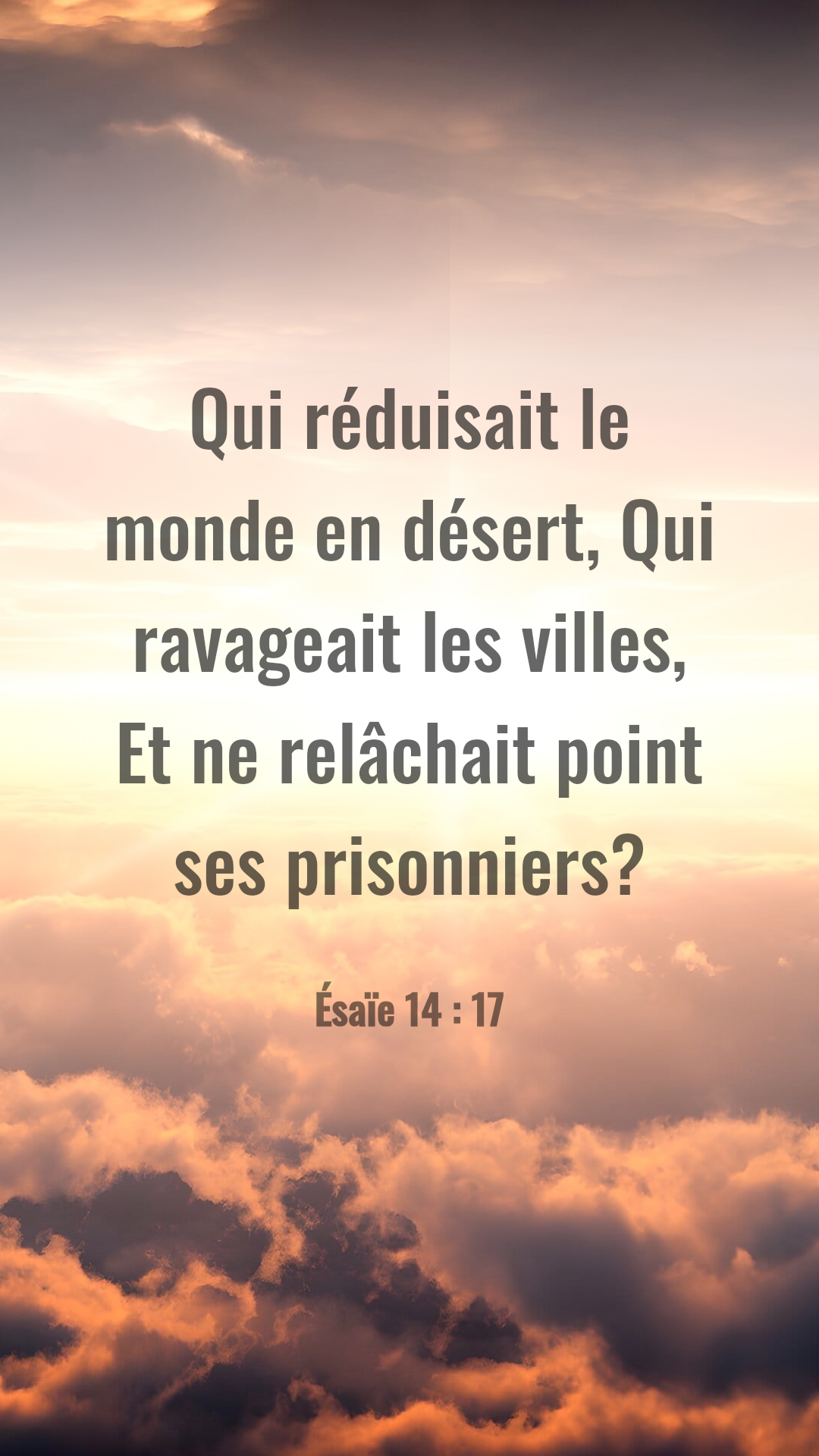 Qui par son comportement se reconnaît dans cet homme ? Le tyran ici se définit comme celui qui détruit tout sur son passage. Il est sans pitié pour les plus faibles que lui. Sous son règne, il n’y a point de clémence pour les prisonniers. Comment un tel homme peut-il procurer la paix ? A la différence, le Seigneur nous donne Sa paix (Jean 14:27). IL nous invite à cette paix, mais nous sommes nombreux à rejeter cette offre. Mais ”à tous ceux qui l’ont reçue, à ceux qui croient en son nom, elle a donné le pouvoir de devenir enfants de Dieu, lesquels sont nés non du sang, ni de la volonté de la chair, ni de la volonté de l’homme, mais de Dieu.” Jean 1:12-13. Que décides-tu ? Que la paix et la grâce de Dieu renouvellent notre intelligence.
