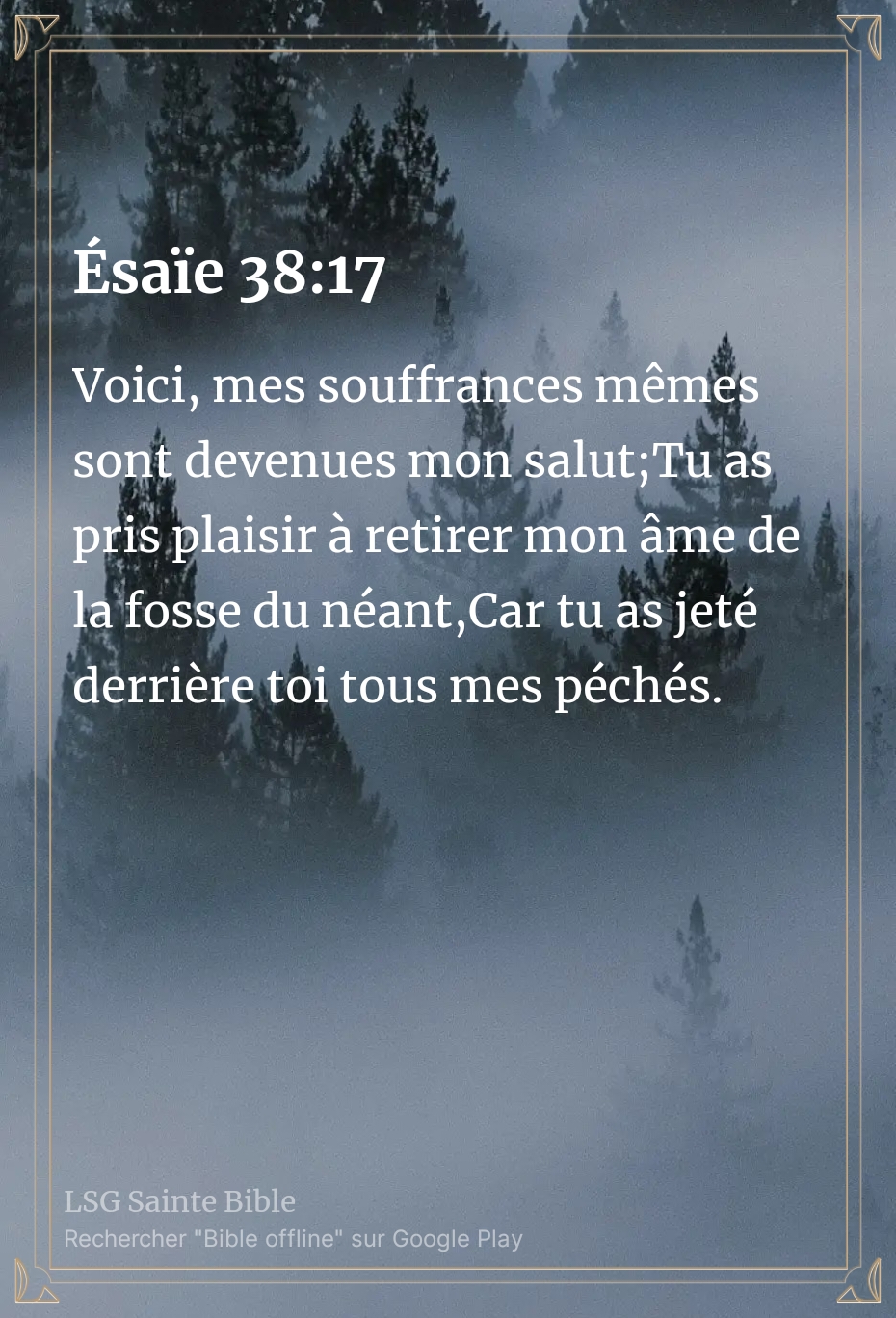 Ici, le roi Ezéchias rapporte que ses souffrances sont devenus des opportunités pour Dieu de manifester Sa Grâce. Dans le gouffre du désespoir, l’Eternel n’abandonne pas les Siens. IL change ainsi toutes les situations en opportunités pour manifester encore Sa proximité avec Son peuple. Les Paroles de Jésus-Christ dans Jean 11:4 au sujet de la maladie de Lazare suivi de sa mort et de sa résurrection 4 jours après, ainsi que Jean 9:3 relatif à la guérison de l’aveugle de naissance, confortent cette vérité. En effet tout est fait pour la manifestation de la Gloire de Dieu.
