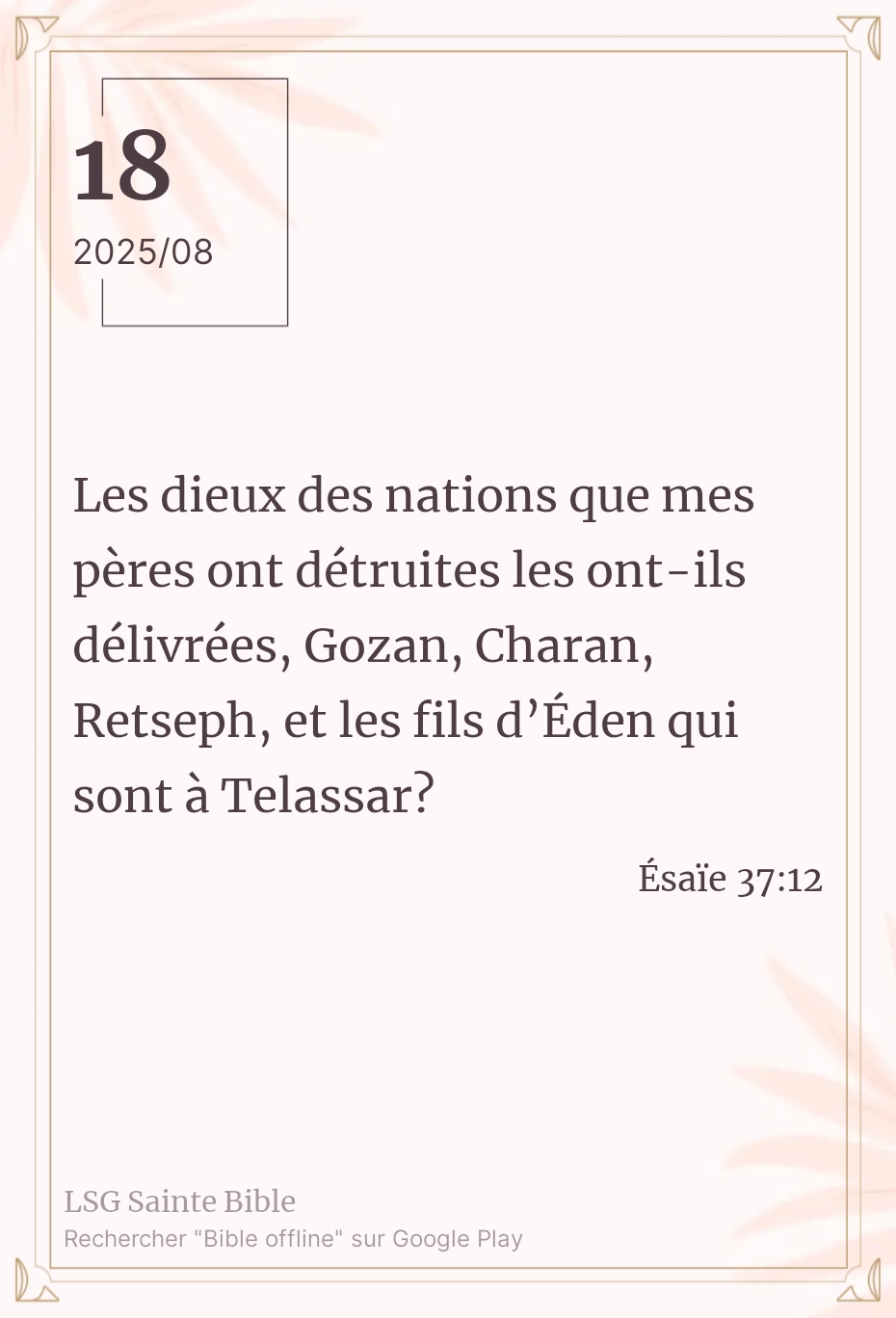 C’est vrai que les dieux de ces rois n’ont pas pu les délivrer, mais est-ce une raison de croire que l’Éternel ne le fera pas pour Son peuple ? C’est ignoré les promesses de Dieu pour Son peuple. Rappelons quelques unes d’elles ”Quand les montagnes s’éloigneraient, Quand les collines chancelleraient, Mon amour ne s’éloignera point de toi, Et mon alliance de paix ne chancellera point, Dit l’Eternel, qui a compassion de toi”. Ésaïe 54 :10. Mon frère, ma sœur, cette promesse reste d’actualité pour toi et pour moi. Que la paix et la grâce de Dieu renouvellent notre intelligence.