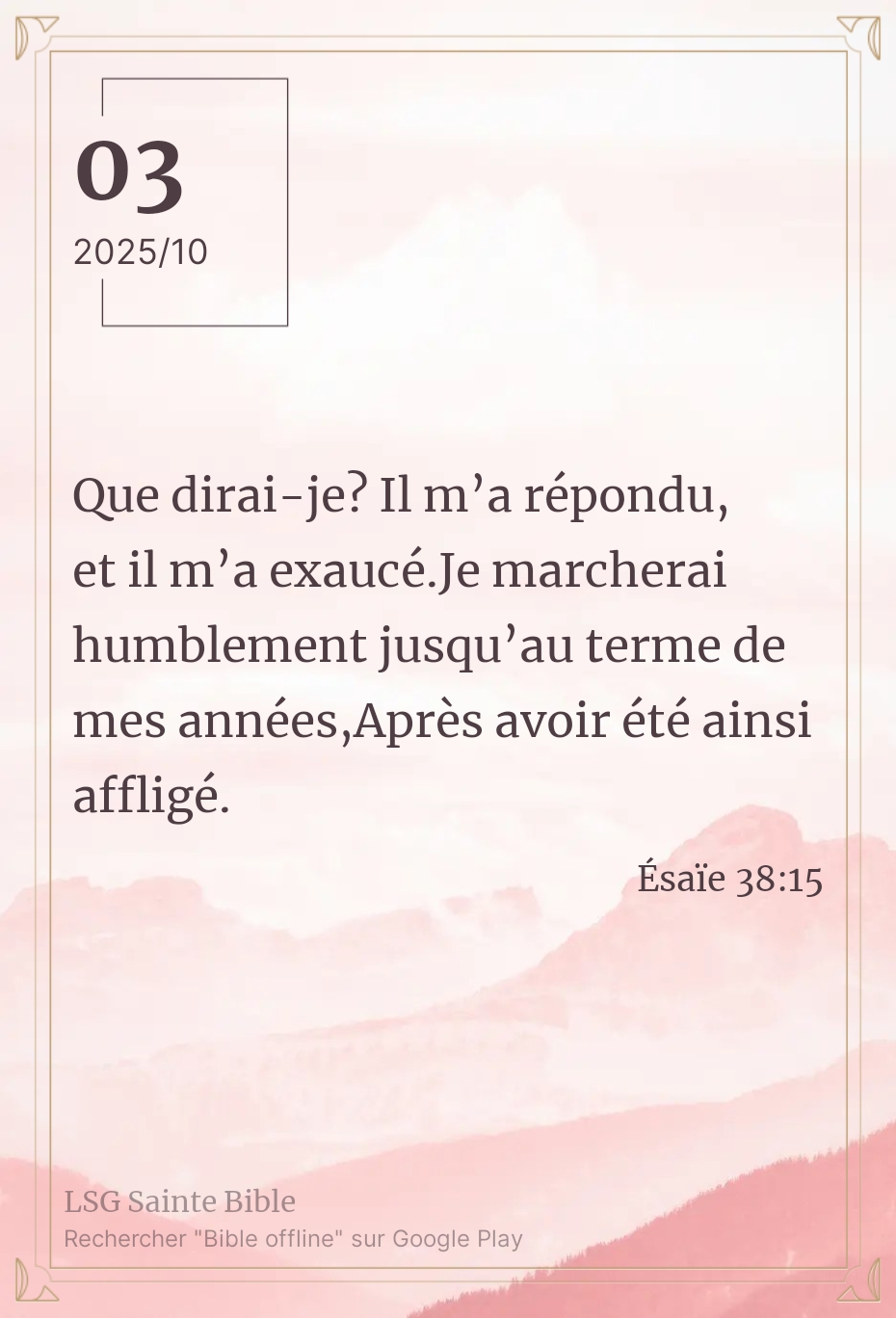 Dans le gouffre du désespoir, l’Eternel a répondu au cri du roi Ezéchias. Ce matin, je ne connais rien de ta situation, mais ce que je sais l’Eternel exauce toujours ceux qui se confient à LUI.J’aimerais t’encourager à renouveler tes forces dans le Seigneur quelle que soit la situation, IL peut t’exaucer. Que la paix et la grâce de Dieu t’accompagnent et te fortifient.