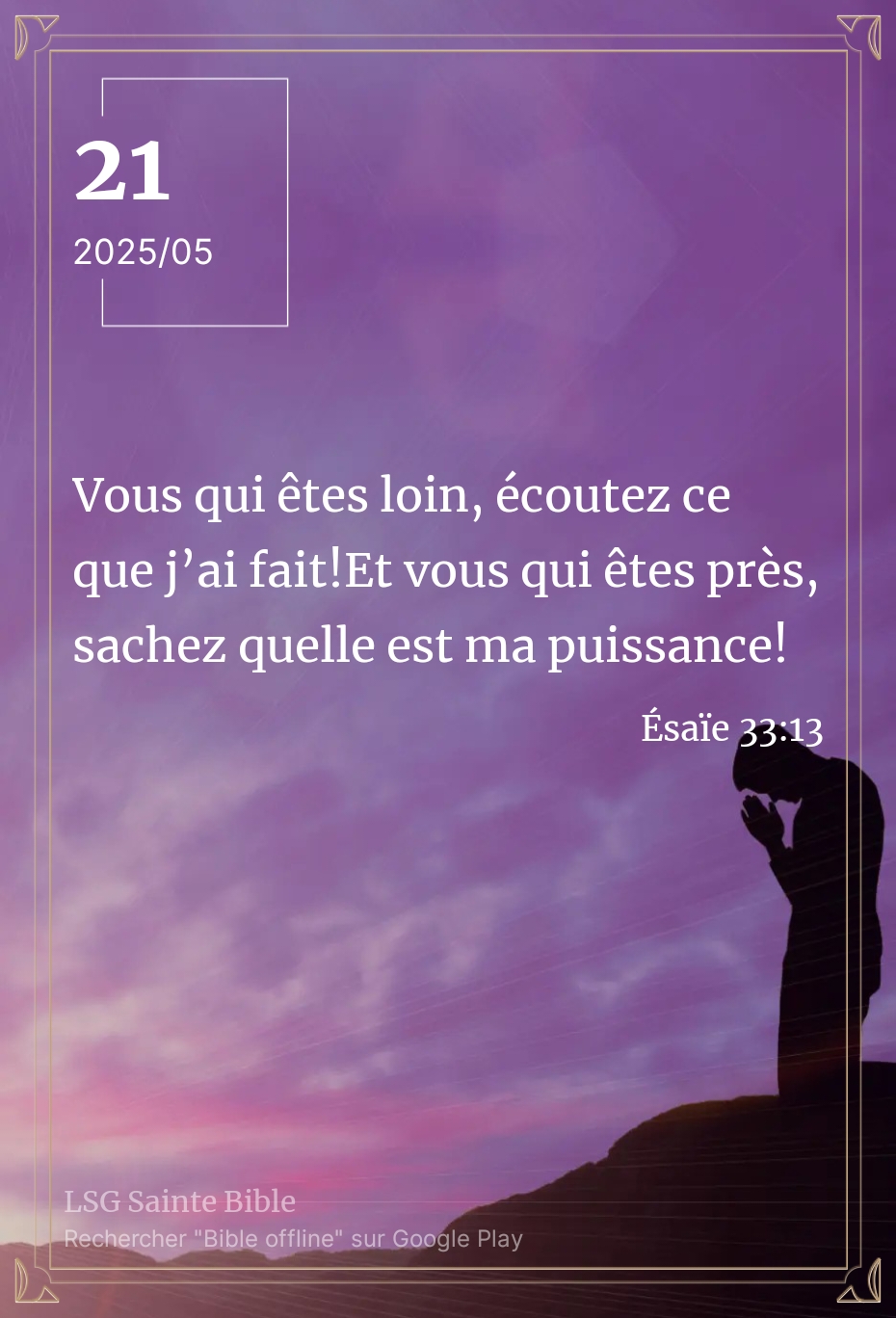 Quand les gens ne veulent pas écouter, l’Éternel LUI-MÊME, vient Se révéler. Ce matin nous lisons ”Vous qui êtes loin, écoutez ce que j’ai fait! Et vous qui êtes près, sachez quelle est ma puissance!”.Ésaïe 33:13.