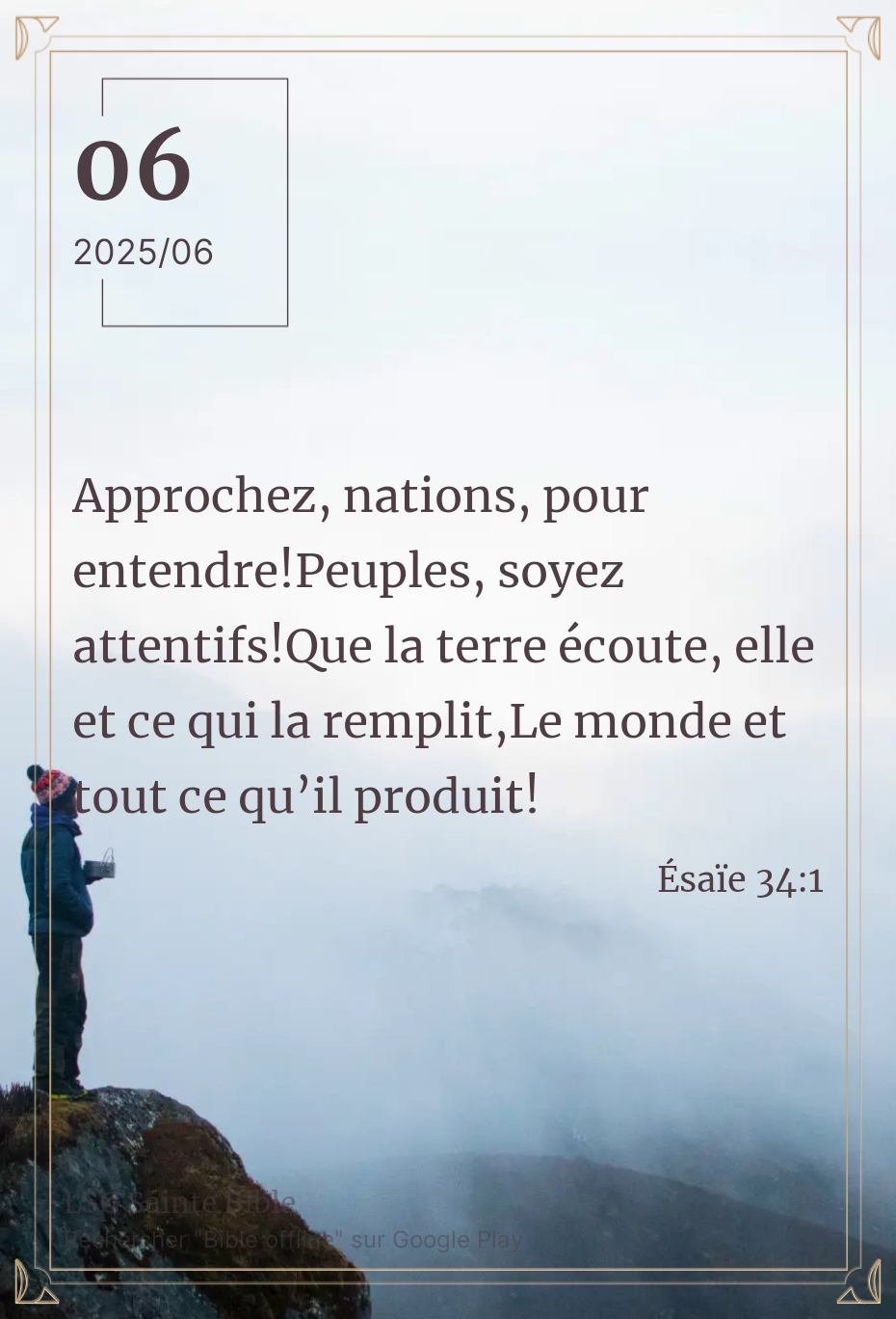 Il y a un temps pour toute chose. Ce matin la Parole nous rappelle un principe essentiel qui est l’écoute de Sa Parole. Nous lisons ”Approchez, nations, pour entendre! Peuples, soyez attentifs! Que la terre écoute, elle et ce qui la remplit, Le monde et tout ce qu’il produit!”. Ésaïe 34:1.