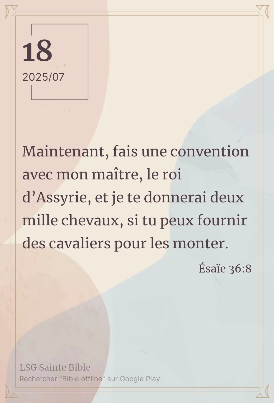 Eh, le but recherché par Rabschaké. Tout ce beau discours, plein de sagesse et de finesse, vise à un seul objectif : détourner Ezéchias et son armée de l’Éternel. Dans notre texte nous relevons deux idées:La première est de signer une convention, un pacte avec le roi d’Assyrie. Cela suppose qu’il doit rompre le premier avec l’Éternel et se livrer pieds et mains au roi d’Assyrie. Cela a été toujours l’objectif recherché par le diable et ses éléments. Même le Seigneur Jésus-Christ n’a pas été épargné par cette stratégie Matthieu 4:8-9‘Le diable le transporta encore sur une montagne très élevée, lui montra tous les royaumes du monde et leur gloire et lui dit: «Je te donnerai tout cela, si tu te prosternes pour m’adorer»”’.   La seconde idée ici est la corruption. Ce matin nous allons insister sur cette idée. Il propose de donner deux milles chevaux, des armes de combats de cette époque. Mais il faut remarquer qu’il ne pourvoit pas en éléments (guerriers) pour les monter. N’est-ce pas un piège ? Abandonner CELUI qui assure une protection optimale, totale et se livrer à un allié qui protège à minima, qu’est-ce qui paraît logique ? Mon frère, ma sœur, c’est ce que Satan nous offre. Beaucoup au lieu de voir le piège qui est derrière, acceptent l’offre de 2000 chevaux. De nos jours, malheureusement ils sont nombreux ceux qui ont choisi ce pacte avec Satan ignorant que c’est pour leur perte. Quelle est ta condition ce matin ? Es-tu avec Dieu ou Satan ? Que la paix et la grâce de Dieu renouvellent notre intelligence.