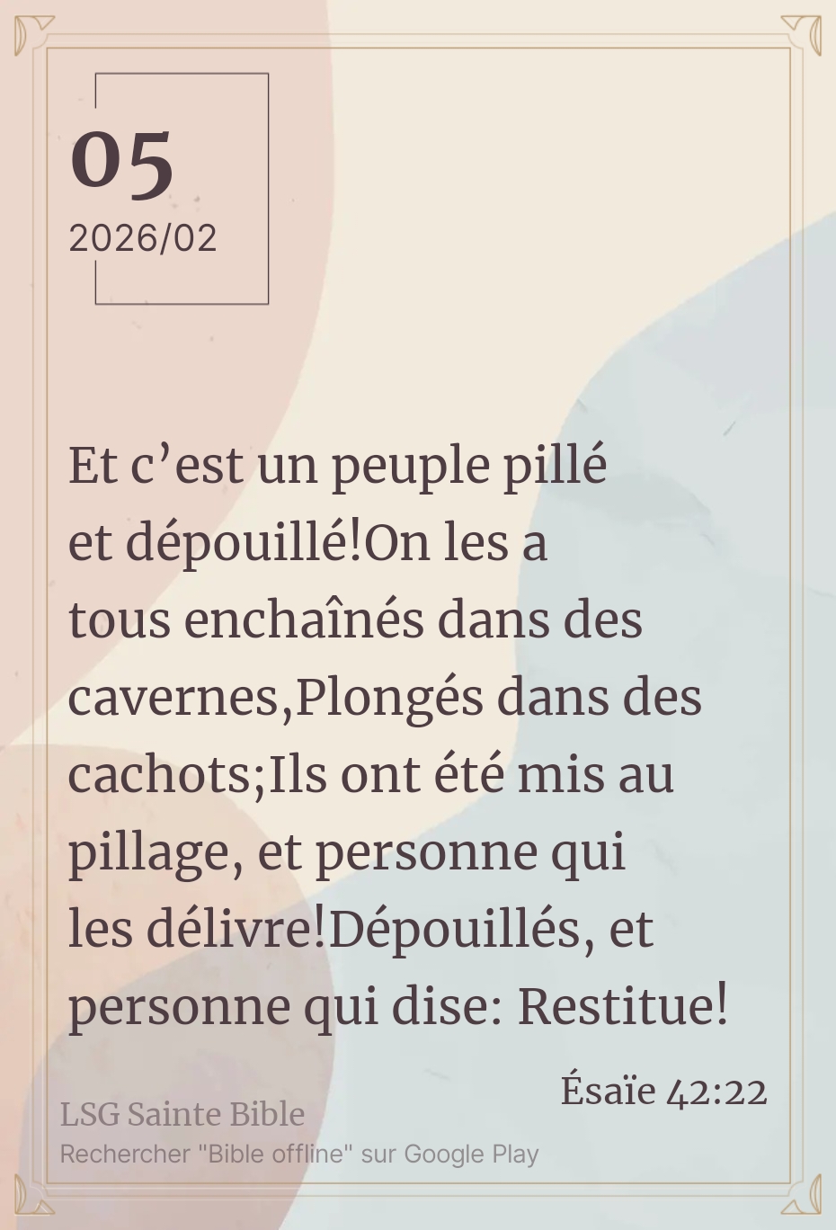 Les difficultés nous amènent souvent à oublier la bonté et la bienveillance de Dieu pour nous. Ce matin nous lisons ”Et c’est un peuple pillé et dépouillé! On les a tous enchaînés dans des cavernes, Plongés dans des cachots; Ils ont été mis au pillage, et personne qui les délivre! Dépouillés, et personne qui dise: Restitue!”. Ésaïe 42:22.