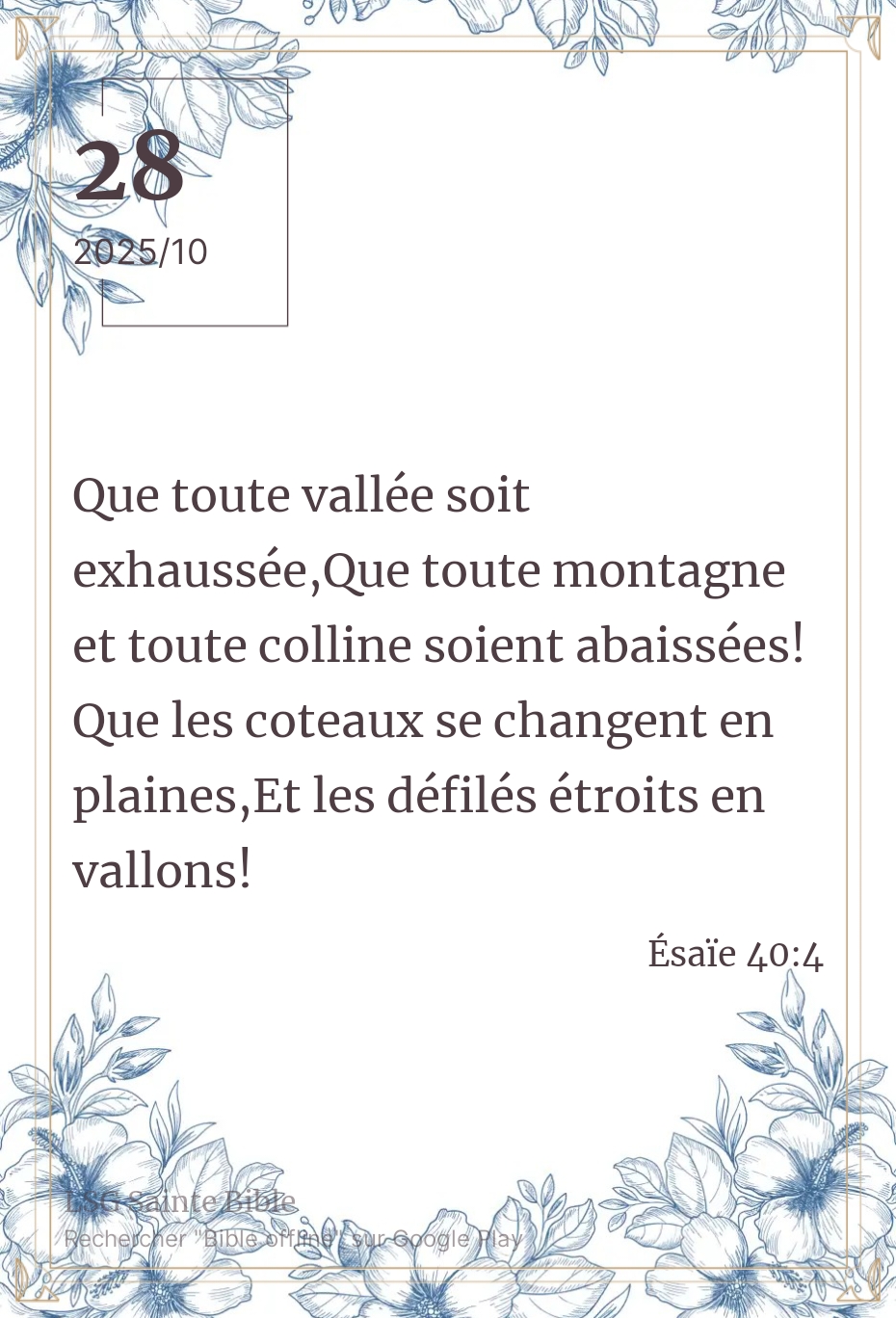 La voix qui résonne dans le désert, exige une préparation. Elle exige un changement obligatoire dans les habitudes. Ce changement porte sur le brisement de l’orgueil et l’élévation de l’humilité qui vont ensembles. Mon frère, ma sœur, ce matin pour cheminer avec le Seigneur Jésus-Christ il faut un changement d’attitude, un changement de comportement compatible avec la Nature de Dieu. Es-tu disposé à cela ? Que la paix et la grâce de Dieu renouvellent nos forces et donne à chacun de marcher selon Sa volonté. Que la paix et la grâce de Dieu conduisent nos pas.