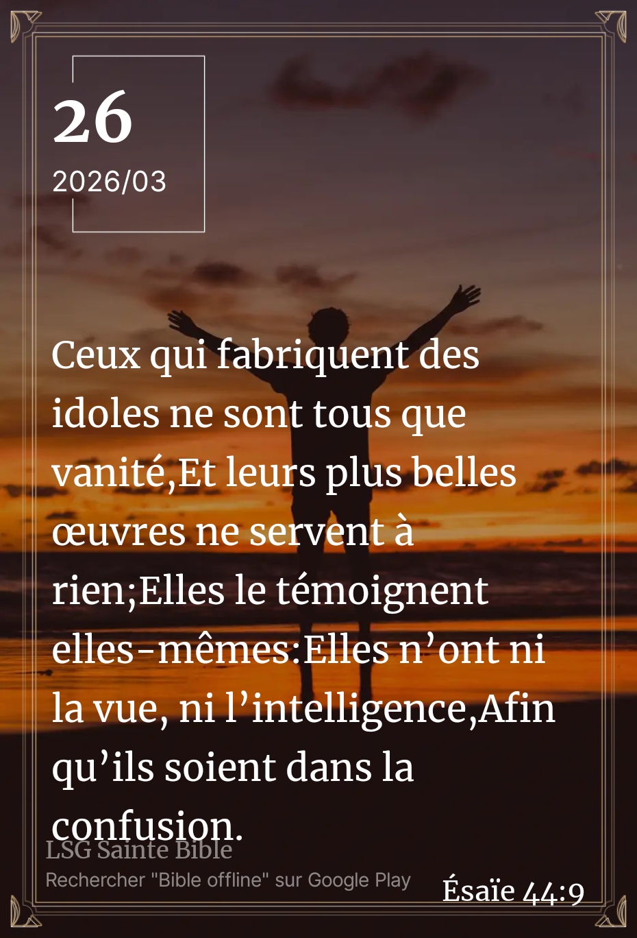 Ce matin l’Éternel a un message pour eux. De qui s’agit-il ? Nous lisons”Ceux qui fabriquent des idoles ne sont tous que vanité, Et leurs plus belles œuvres ne servent à rien; Elles le témoignent elles-mêmes: Elles n’ont ni la vue, ni l’intelligence, Afin qu’ils soient dans la confusion”.Ésaïe 44:9.