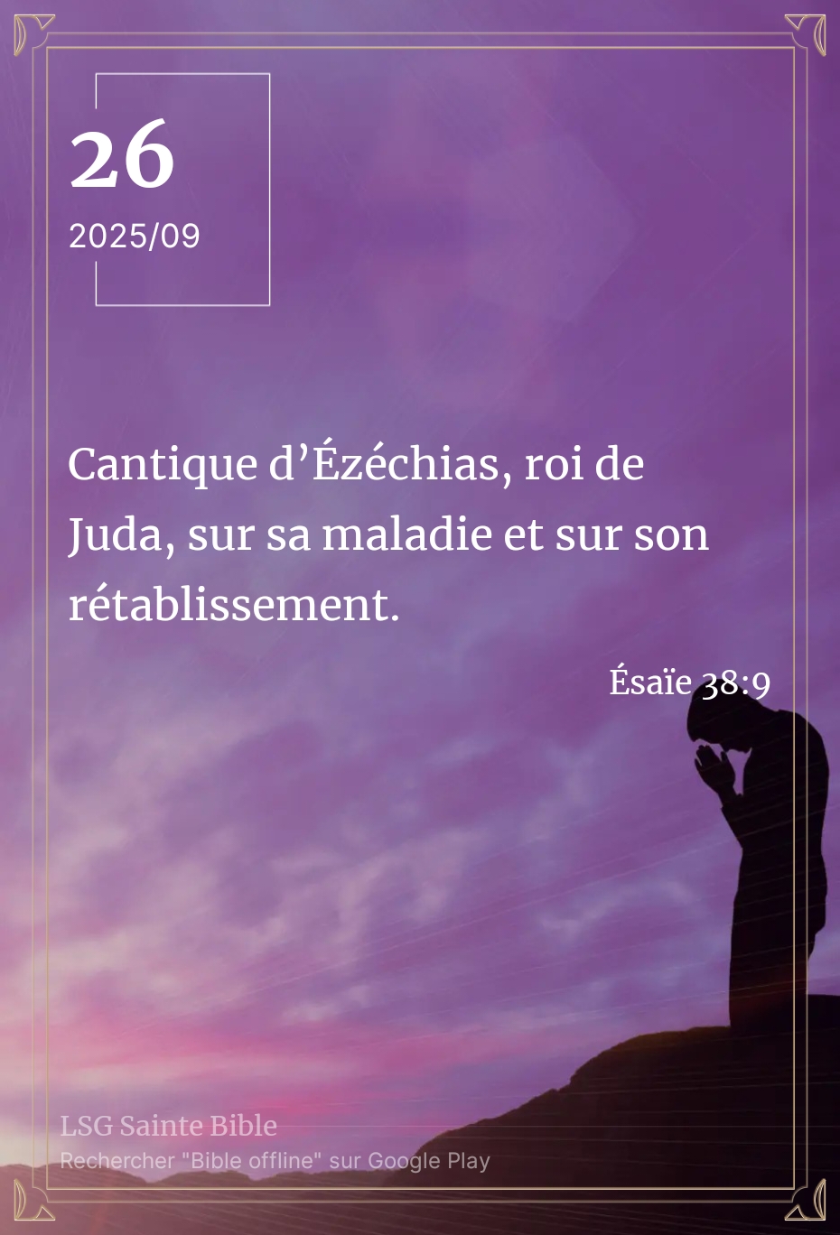 Ses promesses demeurent d’actualité pour toi. Alors n’as-tu pas de raison de dire merci au Seigneur Jésus-Christ ce matin ? Mon frère, ma sœur, Dieu t’a rétabli ce matin. IL te donne LUI-MÊME un signe pour te rassurer ce matin. Tes adversaires ont échoué. Mon frère, ma sœur, ta victoire est certaine et visible. Comme Ezéchias, associe ta voix à la mienne pour dire merci au Seigneur Jésus-Christ. Que la paix et la grâce de Dieu renouvellent tes forces.