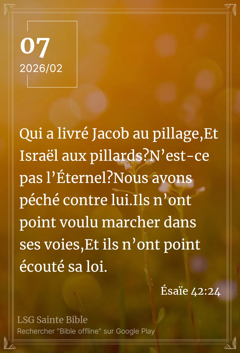 Certaines situations qui nous arrivent sont difficiles à comprendre, mais l’Éternel ne fait rien au hasard. Ce matin nous lisons ”Qui a livré Jacob au pillage, Et Israël aux pillards? N’est-ce pas l’Éternel? Nous avons péché contre lui. Ils n’ont point voulu marcher dans ses voies, Et ils n’ont point écouté sa loi”.Ésaïe 42:24.